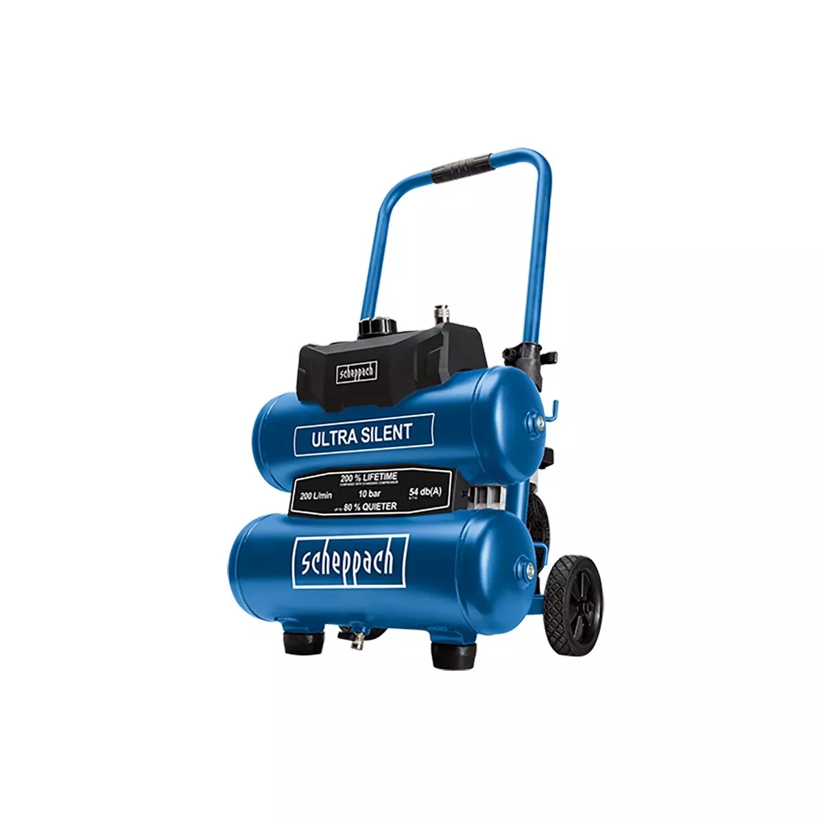 - Kompresor Scheppach HC 20 Si Twin charakterizují nejlépe tři slova – tichý, výkonný a kompaktní. Je vhodný nejenom do každé dílny, ale díky svým parametrům i do míst a provozů s vysokými požadavky na nízkou míru hluku. Hlučnost 54 dB (A) znamená hladinu hluku zhruba na úrovni tlumeného rozhovoru, takže v praxi budete vnímat hluk tohoto kompresoru pouze minimálně. Další výhodou je bezolejová technologie, která znamená, že do vzdušníku ani dále do spotřebiče vzduchu, neunikají žádné olejové páry. To se hodí v potravinářství, u speciálních lakýrnických prací nebo třeba při tlakování výčepních zařízení. Bezolejová technologie znamená rovněž mnohem nižší nároky na údržbu celého stroje. Scheppach rovněž odstranil běžnou nevýhodu tichých kompresorů, a to poměrně nízký sací výkon. Díky nové technologii je sací výkon 200 l/min téměř dvakrát vyšší, než je běžné a je plně srovnatelný s klasickými kompresory. Navíc tato technologie zajišťuje až dvojnásobně dlouhou životnost stroje oproti běžným modelům. Vzdušník o objemu 20 l slouží jako zásobárna stlačeného vzduchu a motor se tak automaticky zapíná jen v případě, že tlak vzduchu klesne pod požadovanou úroveň. Kompaktní dvojitý vzdušník 20 l, spolu s vysokým tlakem až 10 barů, rovněž výrazně rozšiřuje možnosti kompresoru a stroj se tak stává opravdu multifunkčním pomocníkem. Díky němu můžete s kompresorem, mimo běžného huštění a ofukování, provádět i náročnější operace s použitím různých druhů pneumatického nářadí. Kompresor je vybaven dvěma manometry, teleskopickým madlem, držáky na kabel i tlakovou hadici, kolečky a antivibračním podstavcem. Díky své konstrukci je velmi kompaktní a je tak vhodný i na časté převážení a práci v terénu.