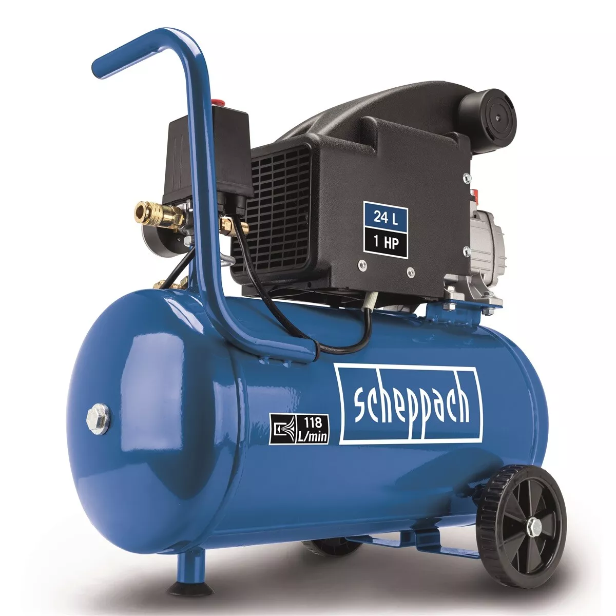 - Kompresor Scheppach HC 24-8 je spolehlivý stroj, který se hodí na všechny běžné práce spojené s huštěním nebo ofukováním. Kompresor pohání moderní úsporný motor o výkonu 750 W, který zajistí rychlé natlakování vzdušníku o objemu 24 l. Vzdušník slouží jako zásobárna stlačeného vzduchu a motor se tak automaticky zapíná jen v případě, že tlak vzduchu klesne pod požadovanou úroveň. Pumpa stroje je mazána olejem, což zajišťuje dlouhou životnost celého kompresoru i při častějším používání. Kontrola stavu oleje je velmi jednoduchá a provádí se zběžným pohledem pomocí optického ukazatele umístěném na stroji. Kompresor je vybaven manometrem vzdušníku, tlakovým spínačem a odkalovacím ventilem. Výstup na vzduch je opatřen rychlospojkou. Přídavné madlo a kolečka umožní snadnou manipulaci se strojem, antivibrační podstavec zase zajistí klidný chod stroje.