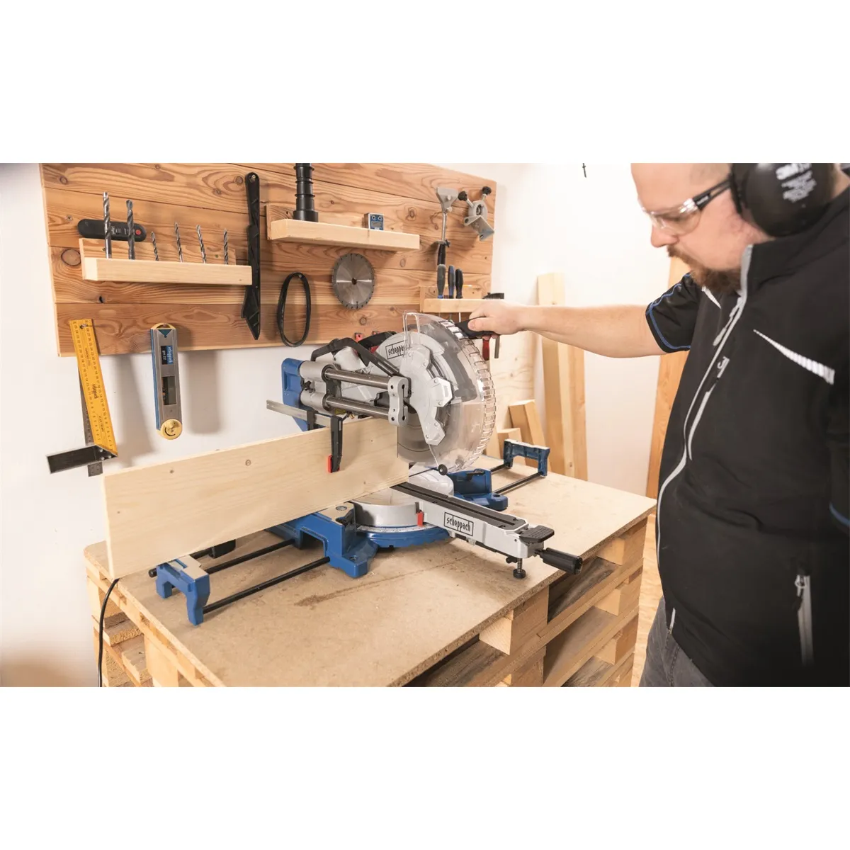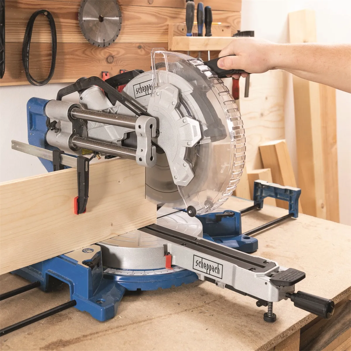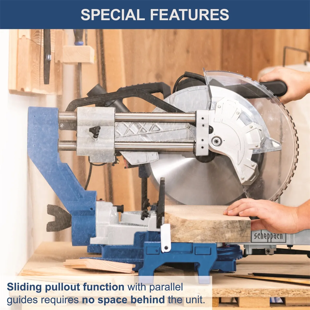 - Scheppach HM 305 SL je velká a výkonná pokosová pila, která je postavená na nové základně s pevnými vodícími tyčemi. To znamená, že i když používáte funkci potahu, pila nepotřebuje žádný prostor za sebou, ale může být přistavena přímo u zdi. To se hodí například při práci ve stísněných prostorech, v menších dílnách nebo tam, kde Vám šíře pracovního stolu nedovoluje ukotvit stroj dostatečně daleko od stěny a funkce potahu by se nedala využít. Díky výškovému prodloužení se do pily vejde obrobek o výšce až 180 mm. Nadstandardní parametry jsou rovněž možnosti úhlování hlavy až do 48° na každou stranu a možnost natočení stolku od -50° do +50°. Pila je postavena na velmi pevném rámu z lehké slitiny hliníku, který je při příznivé hmotnosti nejenom velmi stabilní, ale zaručuje rovněž dostatečně tuhý základ, nutný pro provádění přesných řezů. Standardně je stroj osazen kvalitním kotoučem se 48 zuby z tvrdokovu, který, spolu s vysokou řeznou rychlostí, zajistí hladký a precizní řez bez otřepů. Výhodou pro řezání v tvrdších materiálech je i silný motor o výkonu 2000 W s funkcí pomalého startu a velký prořez 105 mm. Pila je vybavena laserem, pro přesnou kontrolu řezu, přehledným pravítkem, dvěma rozšiřovacími stolky, rychloupínacím systémem pro nastavení úhlu řezu, prachovým sáčkem a svorkou.