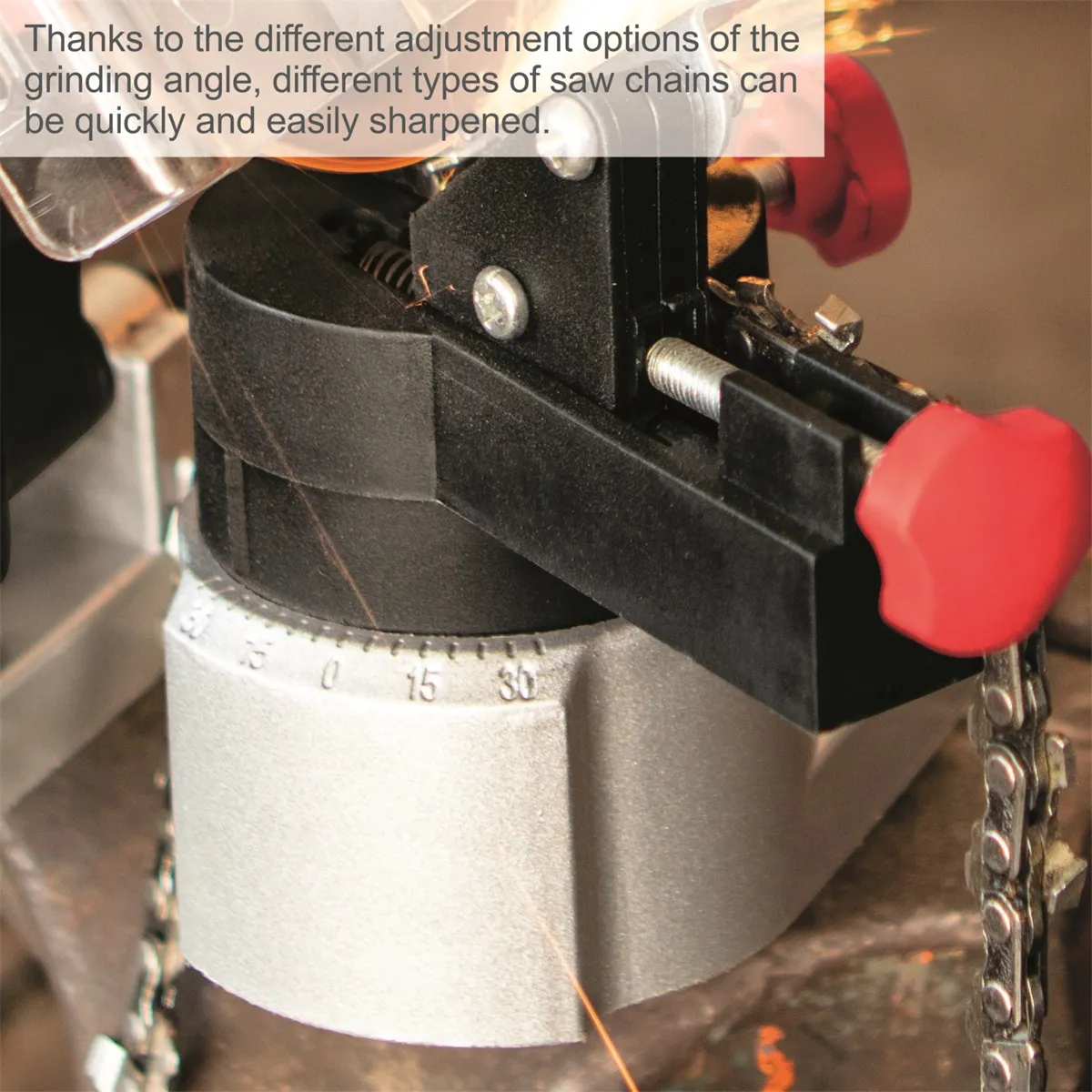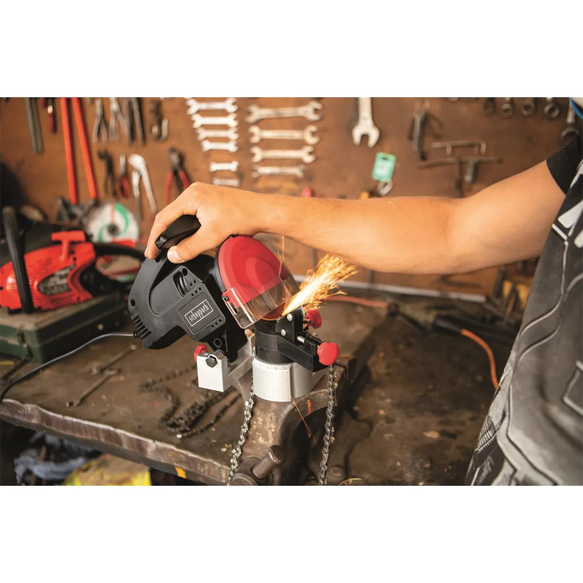 - Při práci s motorovou pilou je nezbytné dodržovat pravidelné intervaly ostření řetězu. Správně by se měl řetěz překontrolovat po každé spotřebované nádrži paliva a drobné vady opravit ručním pilníkem ihned na místě. Podle typu řezaného dřeva se potom každý řetěz časem ztupí natolik, že je potřeba náročnější údržby. K tomu slouží univerzální ostřička řetězů Scheppach, která dovolí i průměrně zručnému uživateli řetěz dobře naostřit a pracovat tak vždy s perfektně připraveným řetězem, díky kterému bude nejenom práce výrazně snazší, ale výrazně se prodlouží i životnost celé pily.Podmínky prodloužené záruky naleznete zde.Případné bezpečnostní pokyny, výstrahy a upozornění jsou součástí návodu k obsluze, který je k dispozici v sekci KE STAŽENÍ.