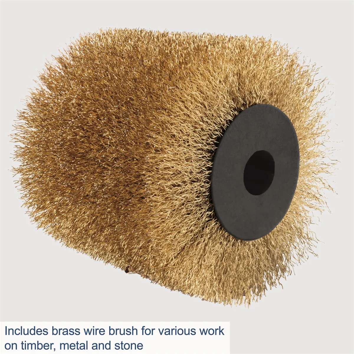 - V základu je bruska osazena mosazným drátěným kartáčem, přičemž je možné samostatně dokoupit dalších 9 typů kartáčů pro různé povrchy a použití.
