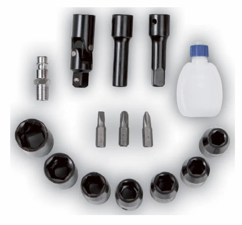 - příslušenství: 7 x 1/2" nástrčných hlavic, prodlužovací nástavec, 3 x bit, držák bitů, kardan, maznička, olej, konektor pro rychlospojku