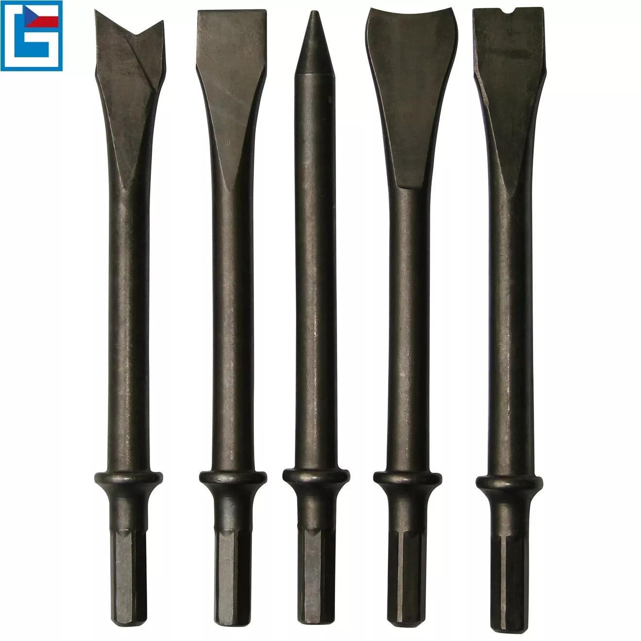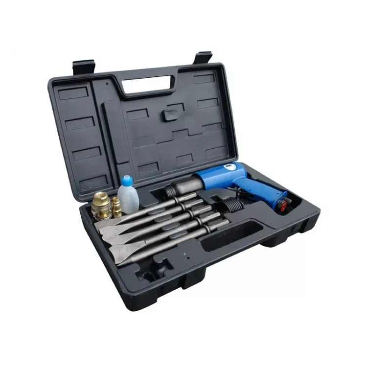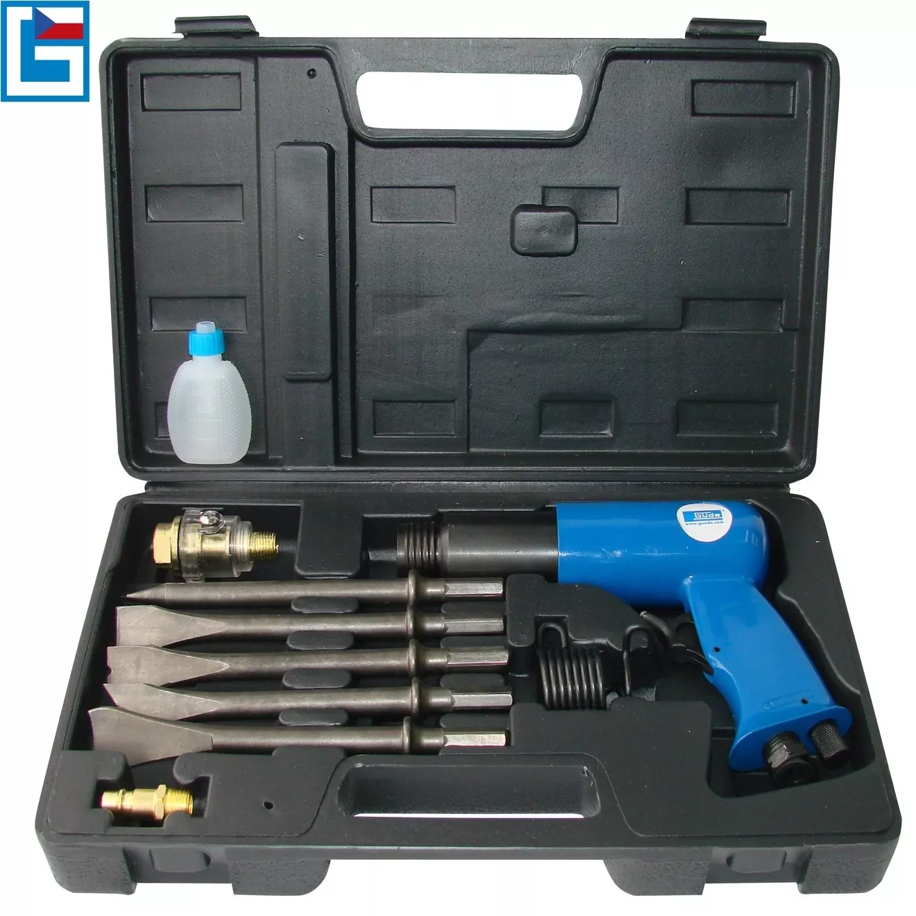 - Složení sady: sekáče 175 mm (-> špičatý sekáč, plochý sekáč, oddělovací sekáč na plech, sekáč na odsekávání čepů, sekáč na střihání plechu), přídržná pružina, mlhový přimazávač, vsuvka 1/4'', plastový transportní kufřík.