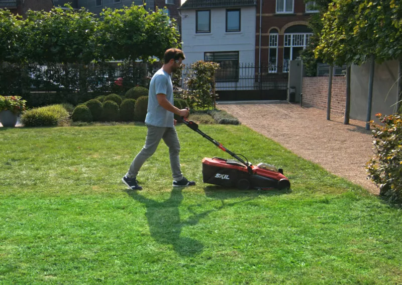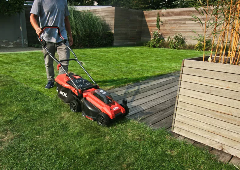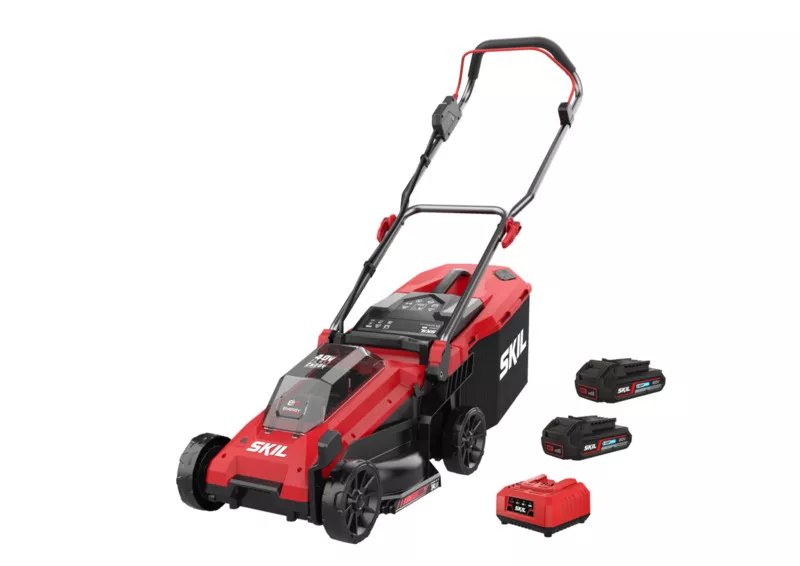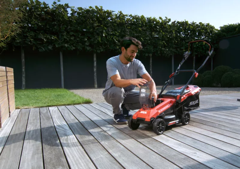- SKIL 0130 je bezuhlíková akumulátorová sekačka na trávu s výkonností „40V Max“ se dvěma akumulátory „20V Max“.
