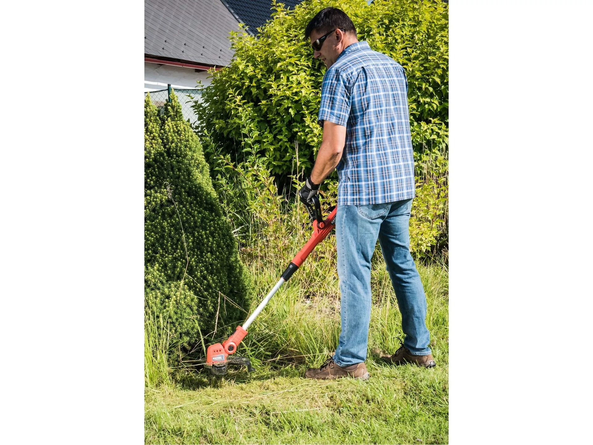 - Strunová aku sekačka je určena k udržování zahradního trávníku, k úpravě okrajů trávníku a sekání trávy v těžko přístupných místech, např. u obrubníků, pod lavičkami, kolem stromů a keřů apod., které je obtížné či nemožné vysekávat pojízdnou sekačkou. Na hlavě sekačky si můžete nastavit její úhel a také ji otočit o 180° což usnadňuje sekání u okrajů trávníků, podél chodníků, příjezdových cest apod. Rukojeť sekačky lze prodloužit až o 23cm, takže s ní mohou pohodlně sekat lidé všech velikostí. Strunu lze prodloužit buď manuálně stiskem tlačítka na sekací hlavě nebo při práci, poklepem o zem. Ochranný kryt struny je vybaven nožem, který automaticky ořízne strunu na patřičnou délku. Díky napájení z baterie již není nutné dávat pozor na napájecí kabel, sekačka je tak lehčí a manipulace s ní pohodlnější. Pogumovaná rukojeť brání vysmeknutí, tlumí vibrace a zpříjemňuje držení při práci. Sekání podél plotů, zdí nebo stromů usnadňuje sklopitelný distanční oblouk, který zároveň šetří sekací strunu.