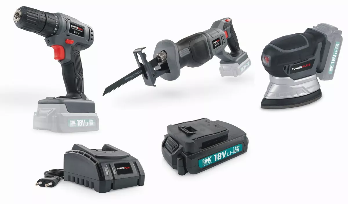 SET Aku vrtačky, ocasové pily, delta brusky, baterie 1,5Ah a nabíječky Powerplus POWEBSET20