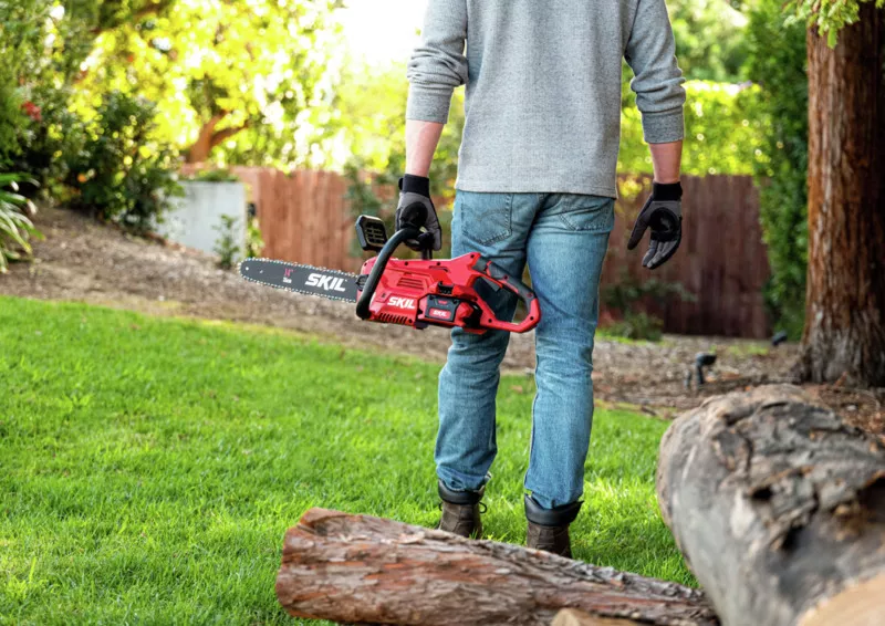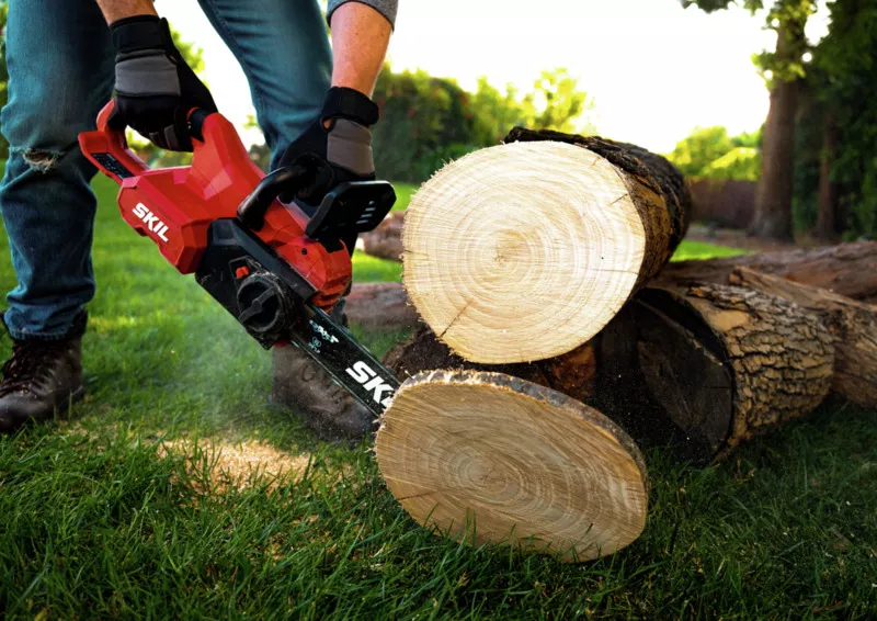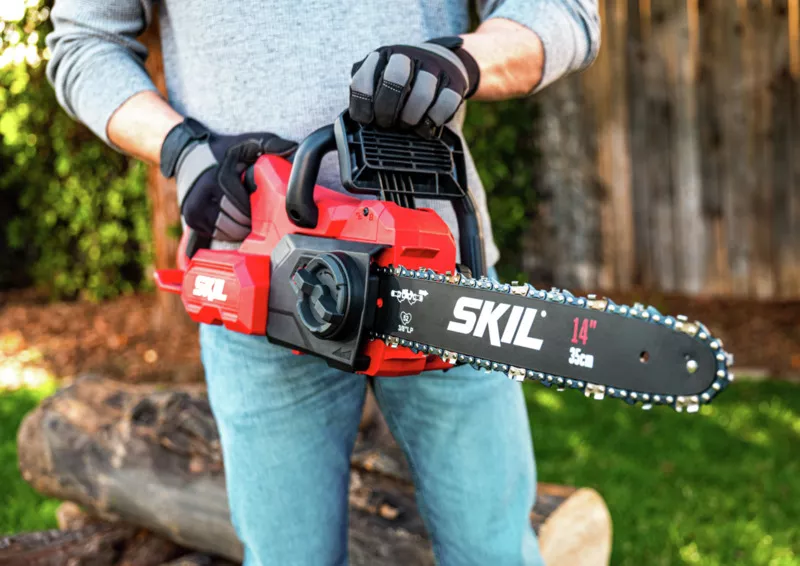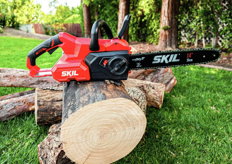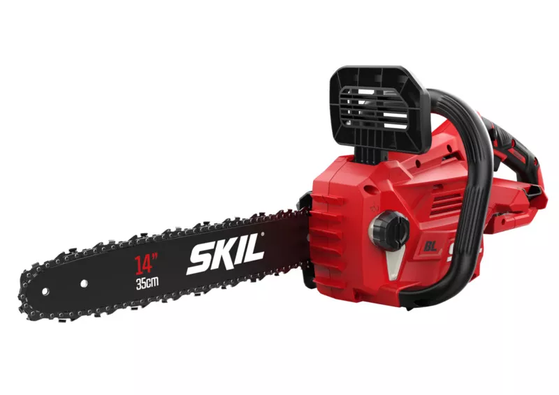 - „40V Max“ SKIL 0581 je bezuhlíková akumulátorová řetězová pila s lištou o délce 35 cm na řezání velkých polen.