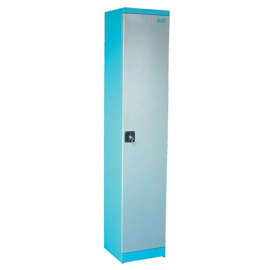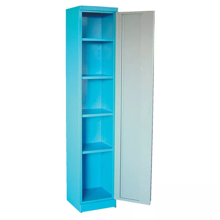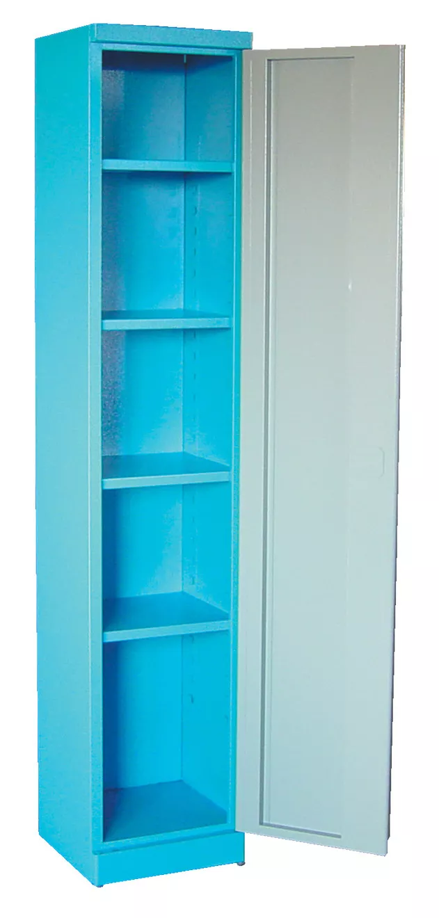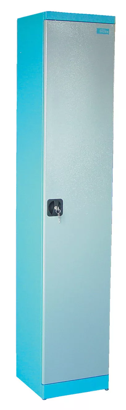- Vybavení: úzká dveřová skříň s uzamykáním cylindrickým/rozvorovým zámkem (-> dvojité uzamčení, 2 klíče); čtyři vyjímatelné police (-> volitelné nastavení výšky, nosnost: 50 kg)