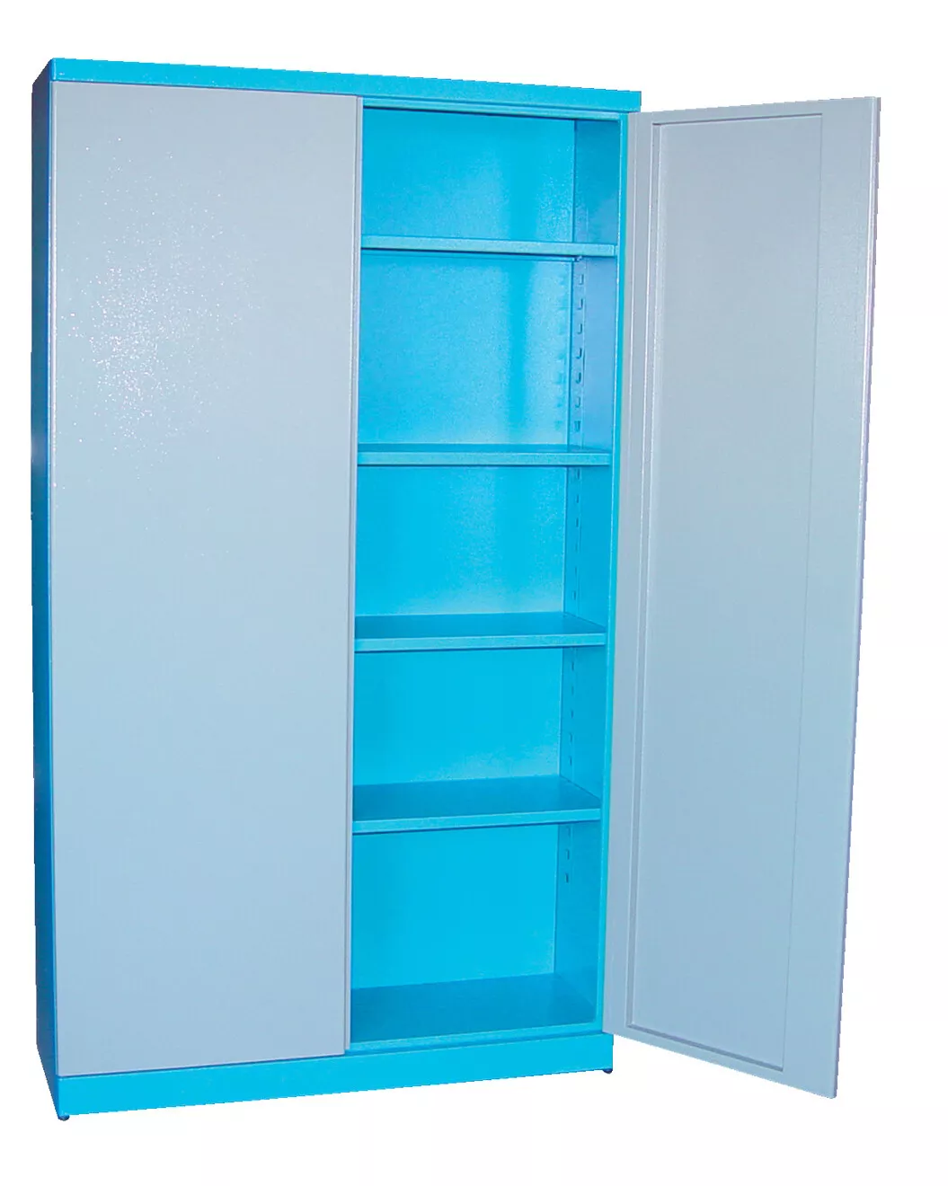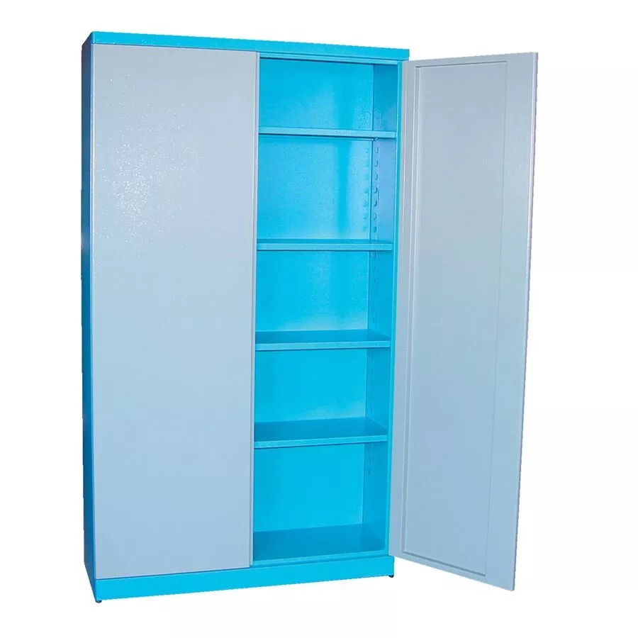 - Vybavení: dvoudveřová skříň s uzamykáním cylindrickým/rozvorovým zámkem (-> dvojité uzamčení, 2 klíče); čtyři vyjímatelné police (-> volitelné nastavení výšky, nosnost: 50 kg)