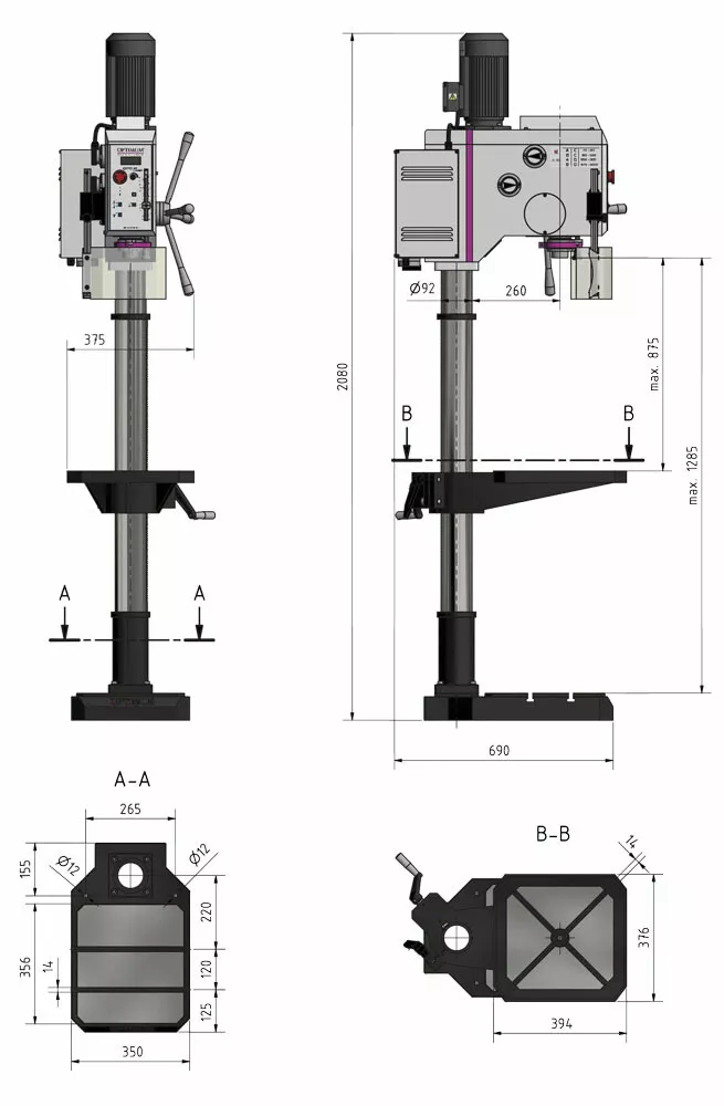 - Max. vzdálenost vřetene a stolu: 875 mm