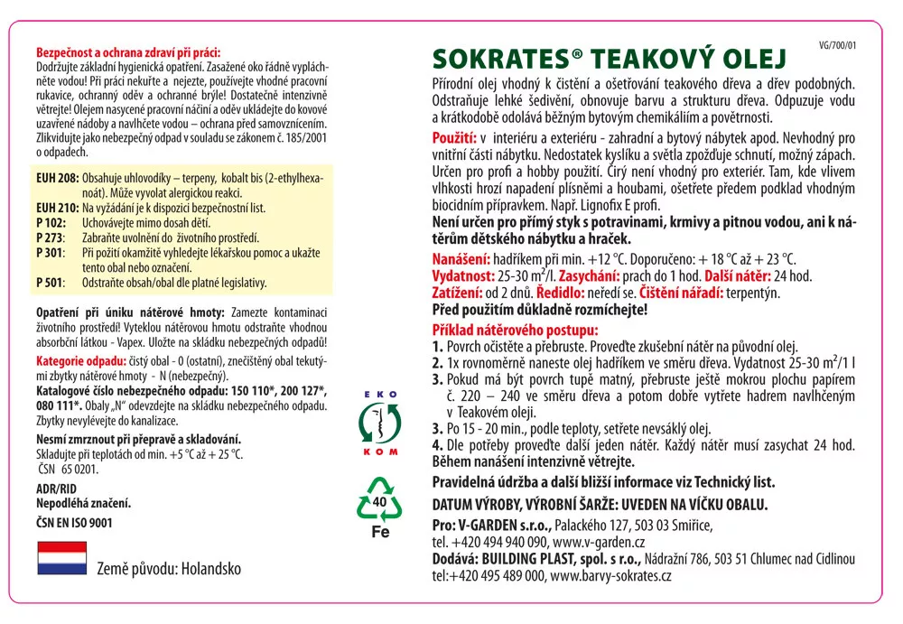 - Vynikající prostředek k čistění a ošetřování zahradního nábytku a jiných výrobků z teakového dřeva, akátu, meranti nebo podobných dřev. Teakový olej Sokrates pochází od holandského výrobce přírodních napouštěcích olejů.