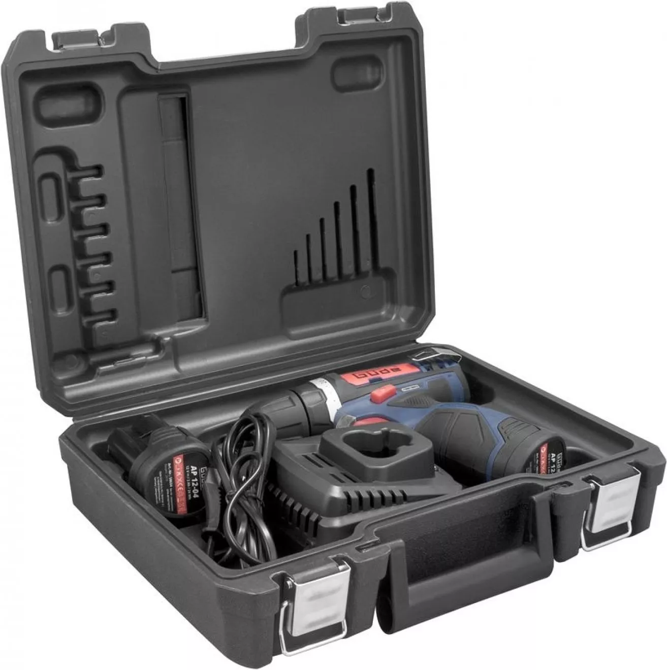 - Vybavení: 2 Li-Ion akumulátory 12 V/2,0 Ah; nabíječka 2,0 A/h; sada vrtáků, 6dílná (HSS; pr
