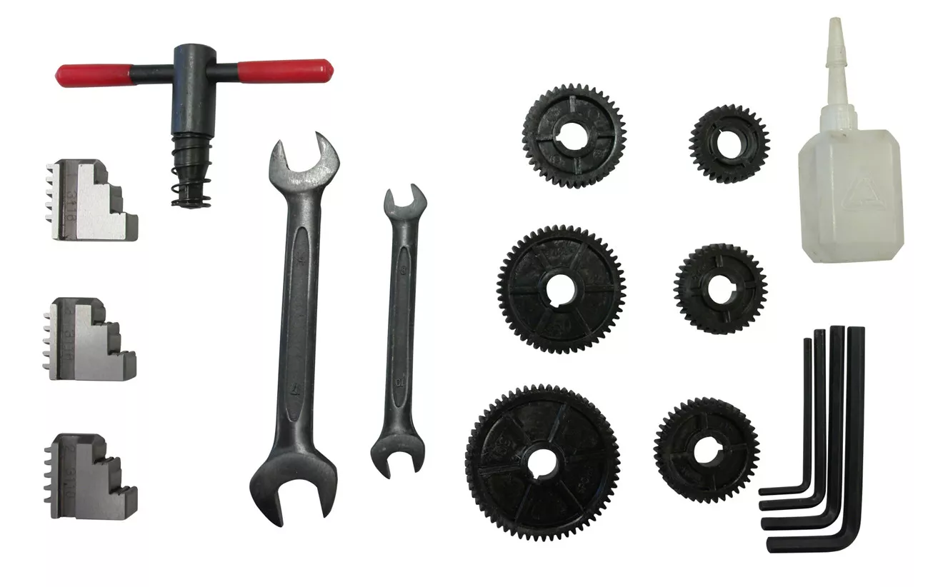 - 80 mm), upínání soustružnických nožů 8 x 8 mm, výkyvný křížový support s ocelovým držákem a ručním kolečkem, posuvné zařízení, koník s ručním kolečkem (kužel pinoly MK 2).Příslušenství (součást dodávky): sada ozubených převodových kol (6), 3-čelisťové sklíčidlo, výměnné čelisti, středící hrot, sada klíčů, olejnička