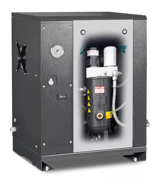 - Standardně dodávaná odhlučňovací skříň umožňuje ustavení kompresoru i v citlivých provozech