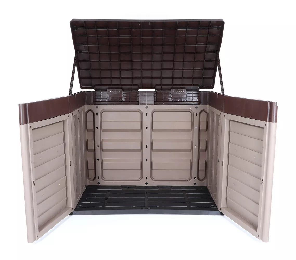 - STARPLAST Ratan box velký 634 L Velmi praktický úložný box s velkým objemem, který je praktický na zahrady, terasy, balkóny, do garáže nebo zimní zahrady na uskladnění podušek ze zahradního nábytku, hraček apod. Lze jej umístit do exteriéru i interiéru. - Sedací víko pro 3 dospělé osoby- Pneumatické písty pro snadné zvednutí víka- Odolné proti povětrnostním vlivům- UV stabilizovaný plast, takže barvy nebudou blednout- Držadla pro snadné přemístění- Uzamykatelný poklop- Větrání- Snadno smontované - nejsou potřebné žádné nástroje- Dodává se rozložený Parametry:Velikost boxu: 157,5 x 75 x H 63.5 cmObjem boxu: 634 LBarva: HnědáVelikost kartonu: 159,5 x 17,5 x 79,5 cm
