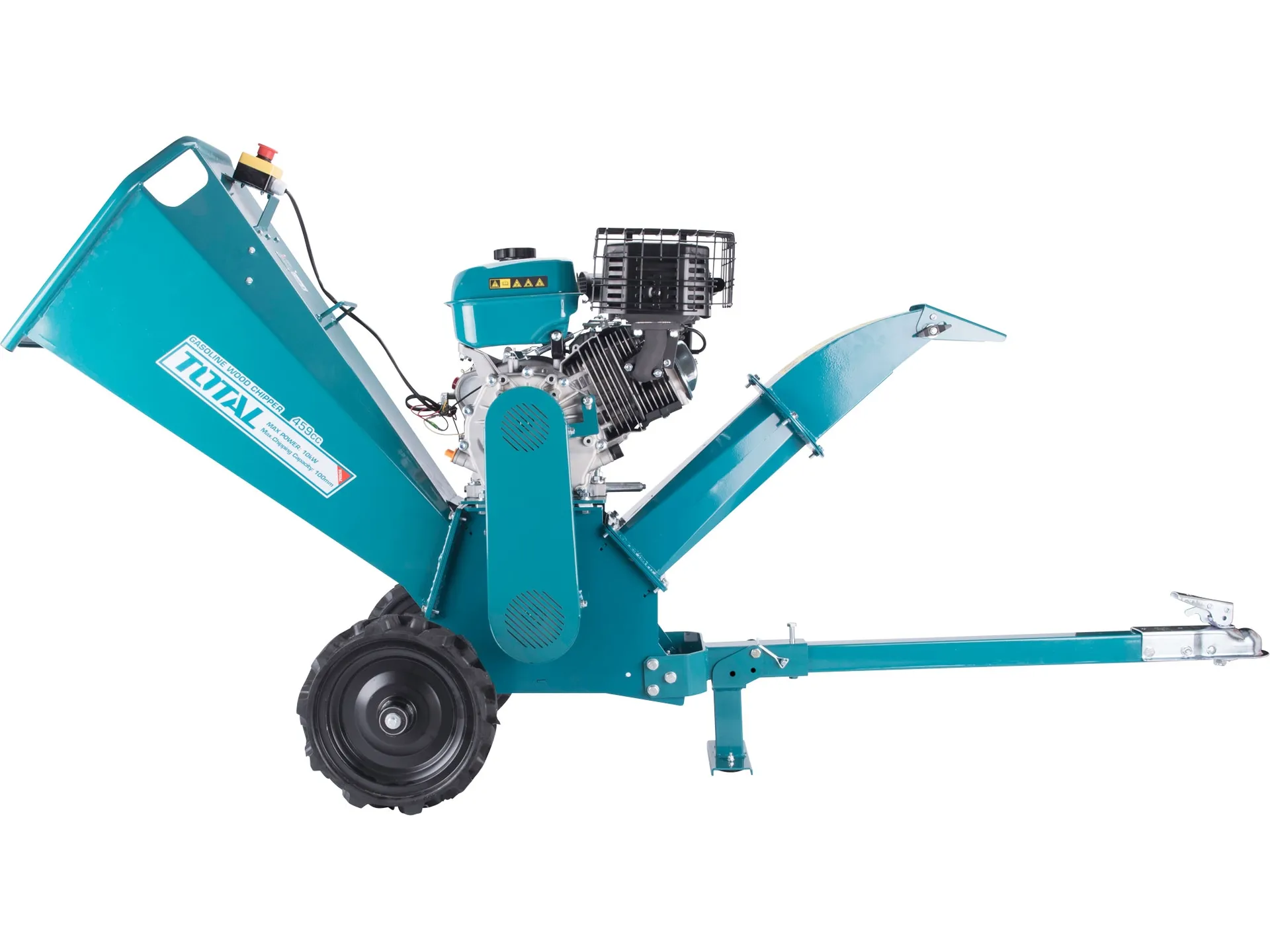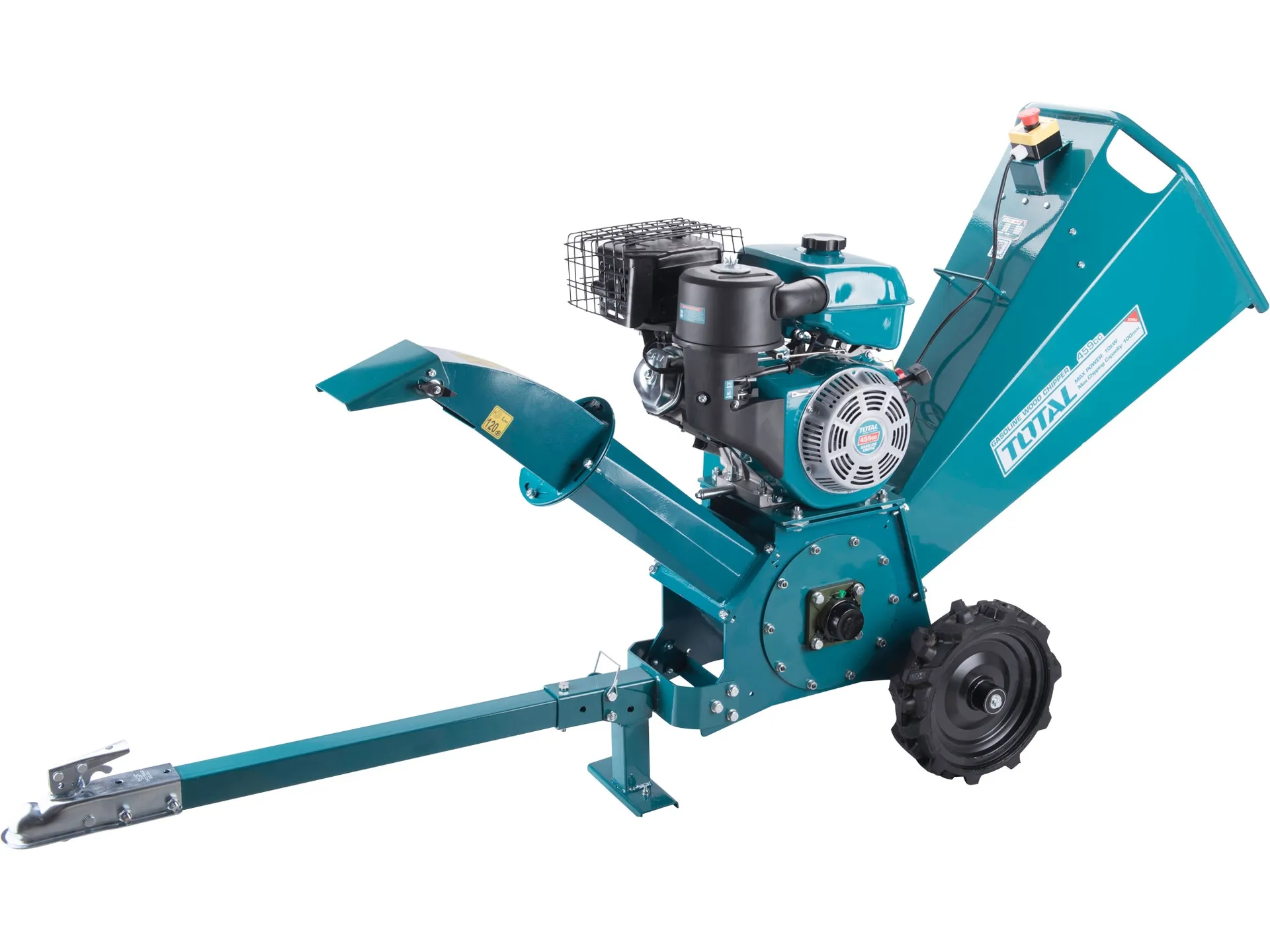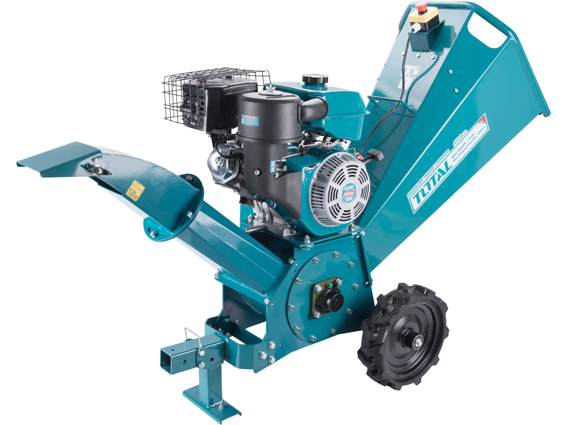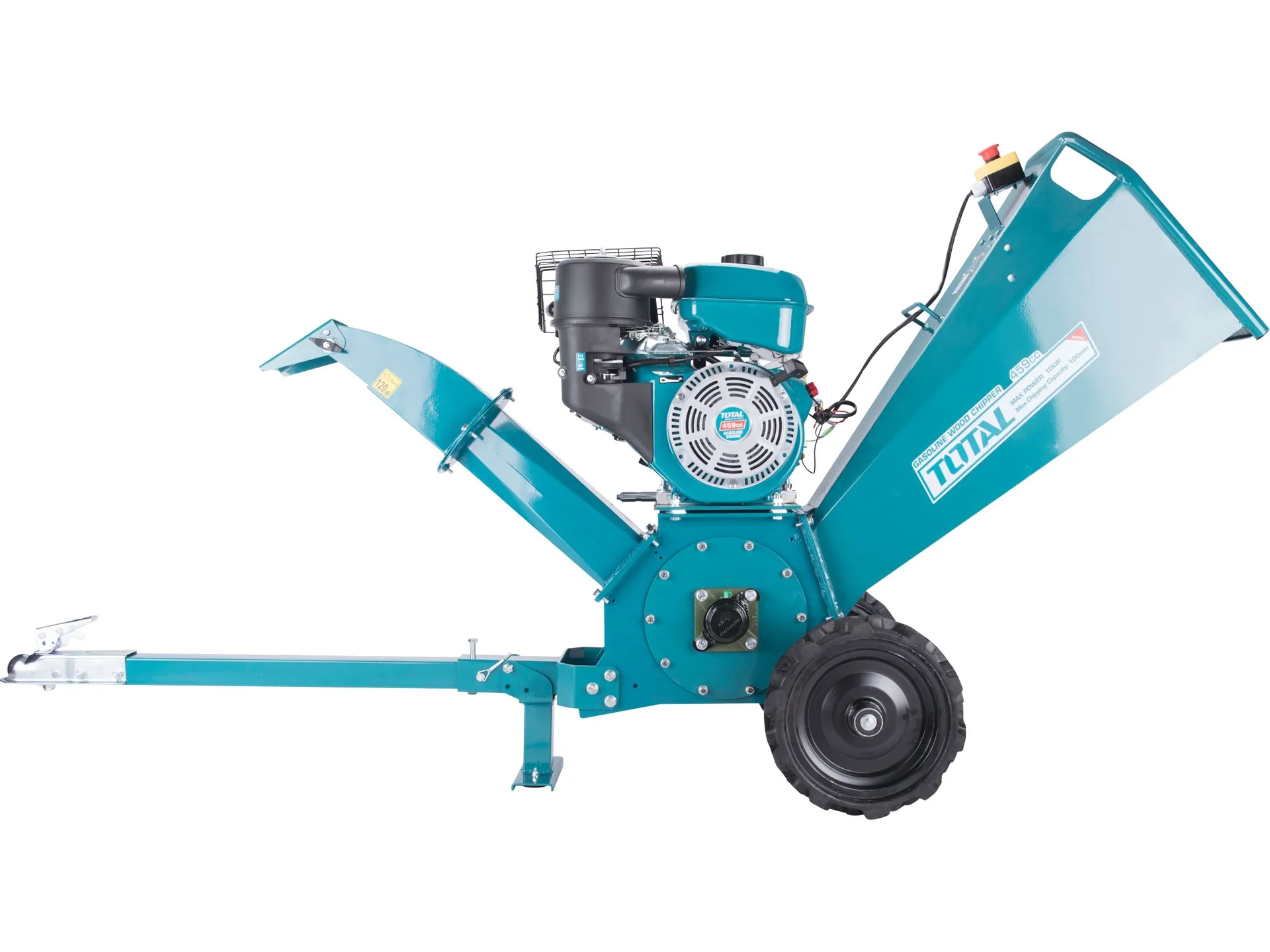 - Výkonný benzinový štěpkovač značky Total je konstruován jako drtič dřeva určený pro drcení všech druhů čerstvě nařezaného dřeva s průměrem specifikovaným v technických datech (liší se podle modelu stroje).Stroj také umožňuje drcení kořenů, ale tyto kořeny musí být očištěny od písku, zeminy, kamenů a jiných materiálů. Maximální průměr větví 100mm, Velikost štěpky (po zpracování): 7-35mm. Účinnost štěpkování je až 1000kg/h. Otáčky nožového kotouče 3000/min. Rozměr čepele: 195*55*7mm. Jmenovitý výkon motoru je 10kW, Zdvihový objem motoru 459 cm krychlových, Startováno ručním navíjecím startérem. Celkové rozměry (d x š x v) jsou 1 685 × 660 × 1 135 mm. Hmotnost stroje je 115kg. Průměr klikového hřídele 25mm. Rozměr pneumatiky 5.00-9. Doporučený typ oleje je SAEl0W-40, objem oleje 1,1L. Typ paliva bezolovnatý benzín s oktanovým číslem minimálně 92.