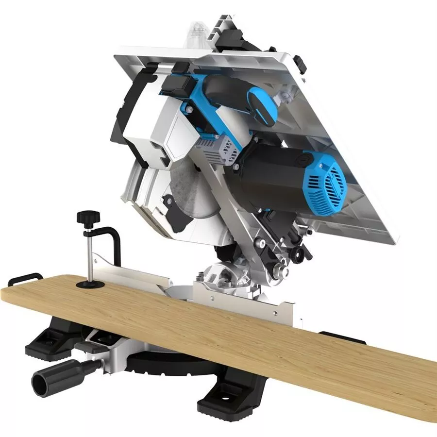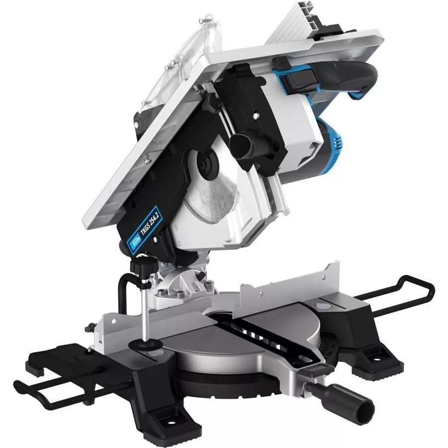 - na pokos (dvojitý pokos) v rozsahu 45° • s plným uplatněním v domácích dílnách, při přestavbách interiérů ap.Rychlá (snadná) změna provozních režimů pily z okružní na zkracovací (a naopak) pomocí zajišťovacího šroubu • zkosené řezy zleva (L 45° - 0°) i zprava (R 0° - 45°) zásluhou oboustranného naklánění pilového kotouče. SOFT START - elektronicky řízený (pozvolný) rozběh motoru • pilový kotouč s břitovými destičkami ze slinutého karbidu (254 x 30 x 2,6 mm - 48 z) • vyznačení linie řezu laserem.Stůl okružní pily (vrchní) se stavitelným podélným - úhlovacím dorazem • otočný řezací stůl, zaručující precizní zkrácení řeziva příčně i na pokos