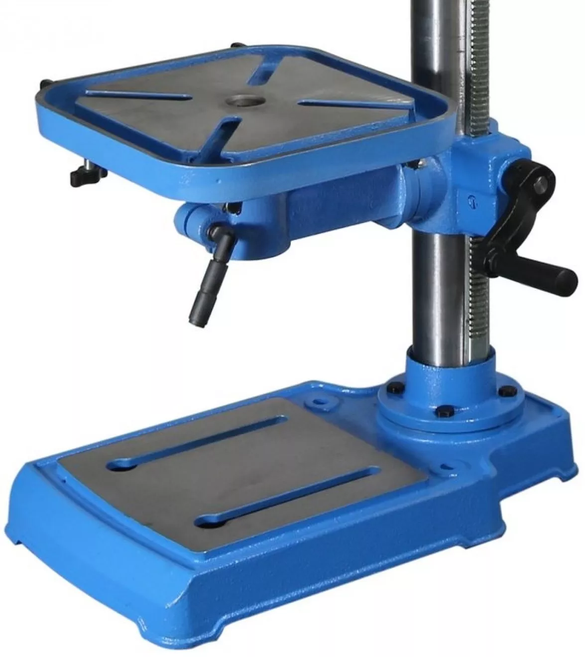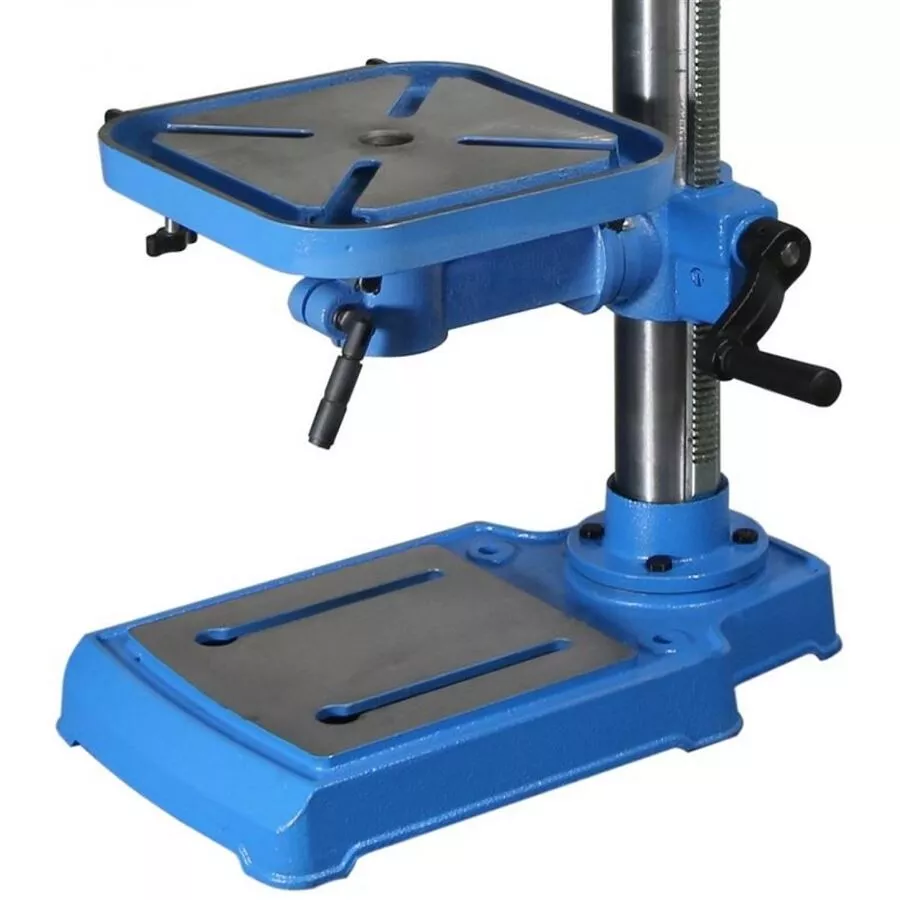 - Konstrukce: párová kuželová kola (2), vřeteno s kónickým úchytem/přesnými kuličkovými ložisky, kuželový trn MK2, robustní vrtací stůl (d x š: 245 x 245 mm; s příčnými drážkami pro upevnění svěráku), stojná deska z litiny (d x š: 245 x 410 mm, včetně vývrtů pro stacionární ukotvení vrtačky).