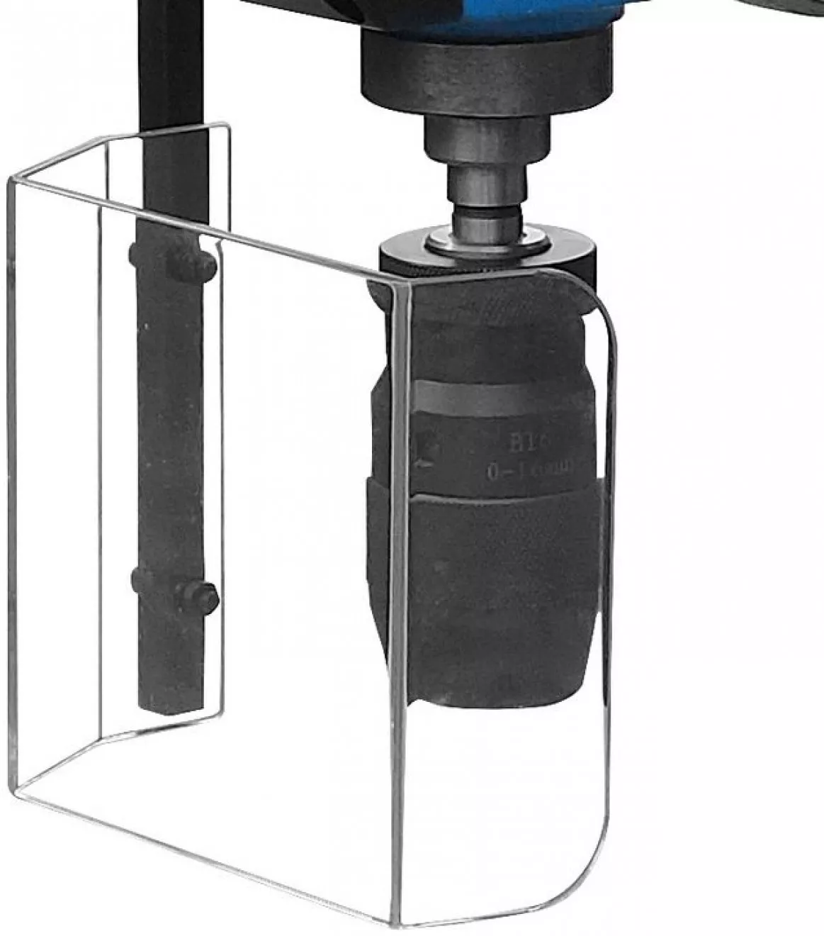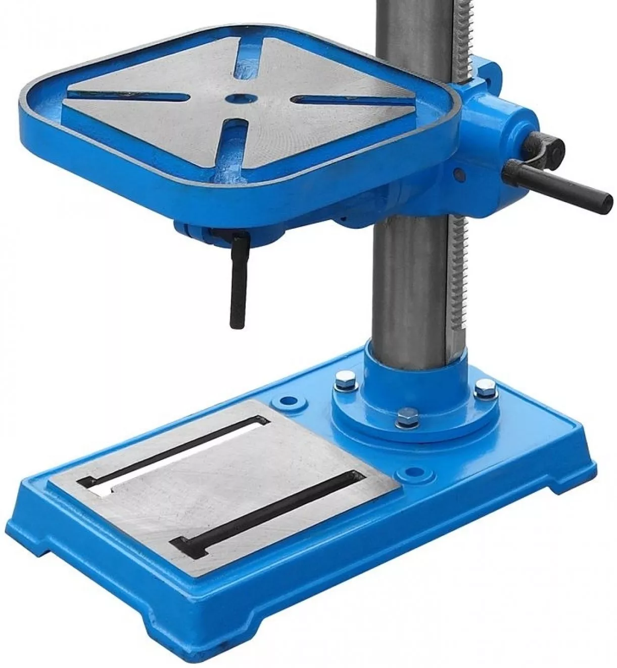 - Konstrukce: ocelové řemenice (3), vřeteno s kónickým úchytem/přesnými kuličkovými ložisky, kuželový trn MK2, masivní vrtací stůl (-> d x š: 260 x 260 mm; s příčnými drážkami pro upevnění svěráku), stojná deska z litiny (-> d x š: 240 x 410 mm, včetně vývrtů pro stacionární ukotvení vrtačky)