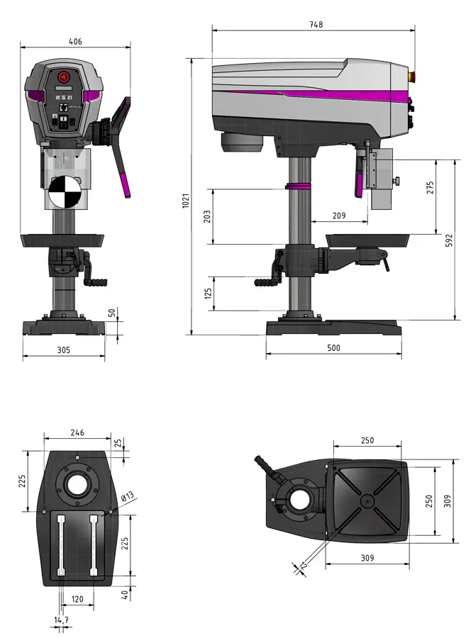 - Max. vzdálenost vřetene a základny: 592 mm