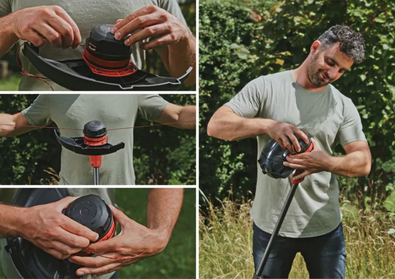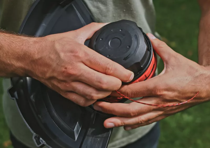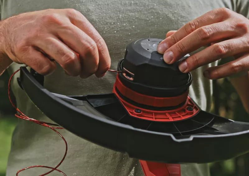 - Stačí přitisknout k zemi tlačítko pod cívkou se strunou a struna se automaticky odvine.