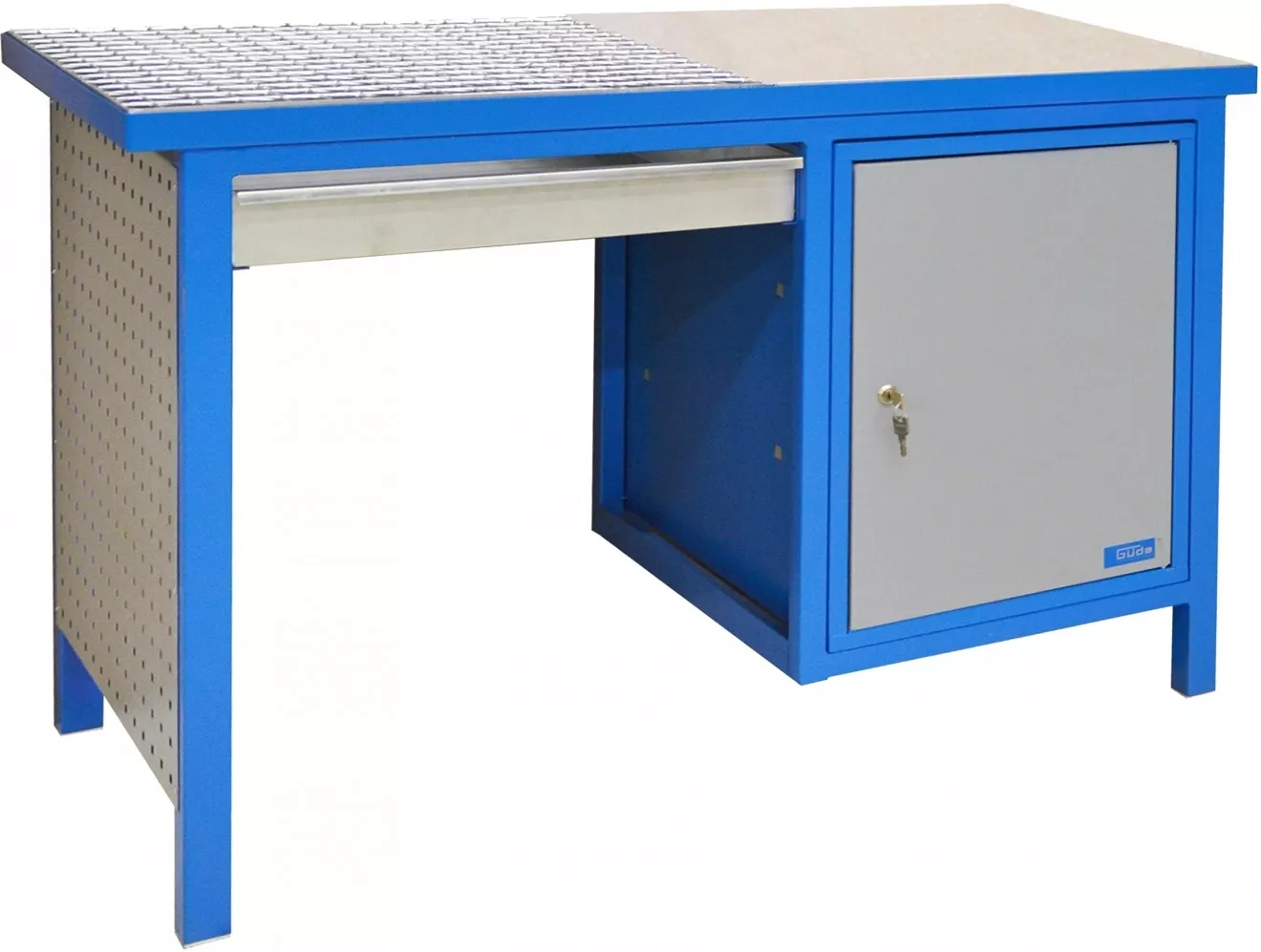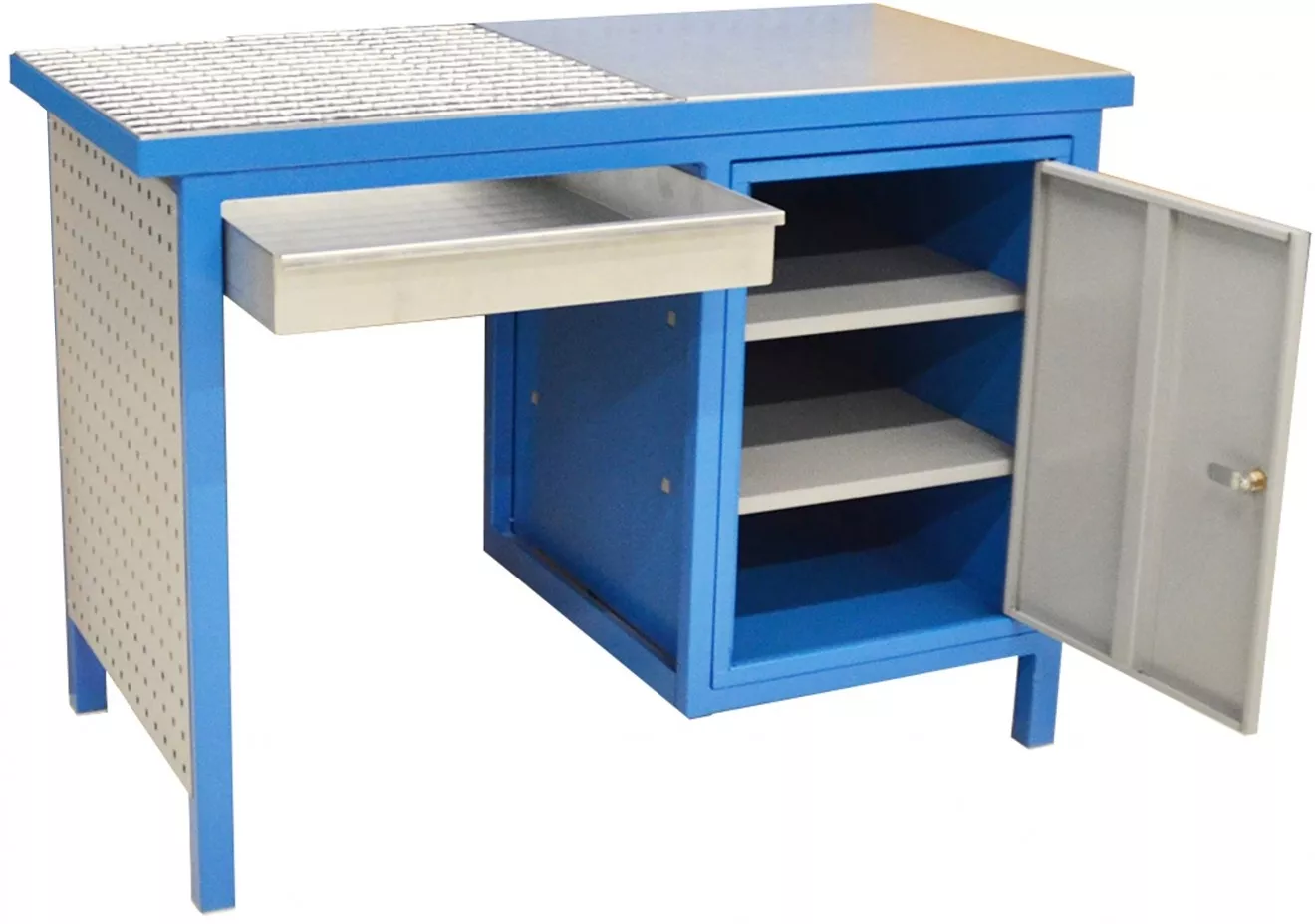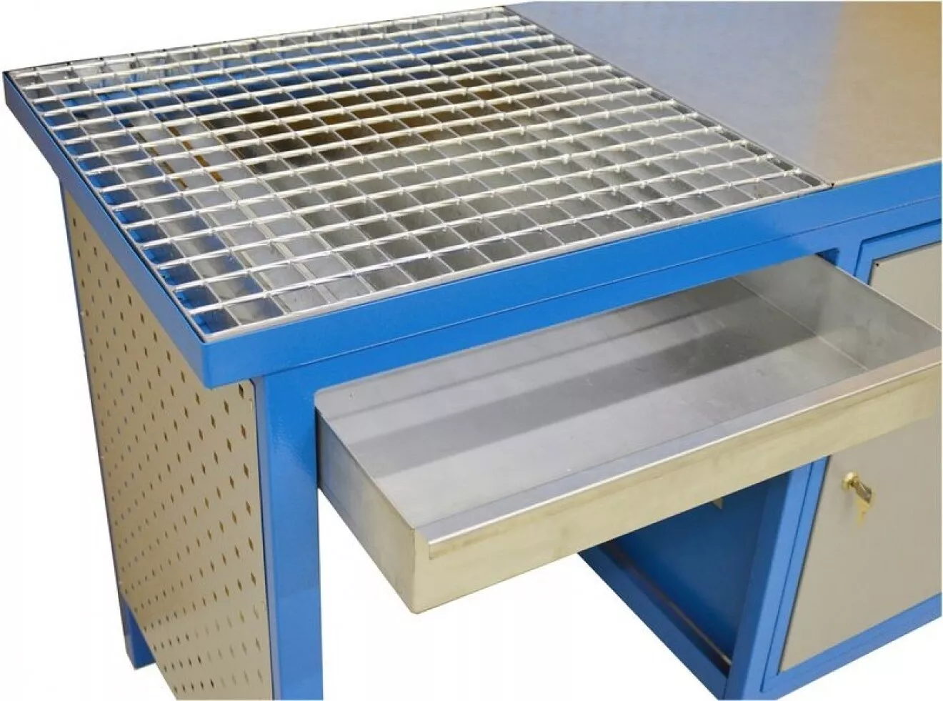 - Odkládací část pracovní desky z pozinkovaného plechu (-> d x š: 600 x 600 mm); uzamykatelná skříňka se 2 policemi