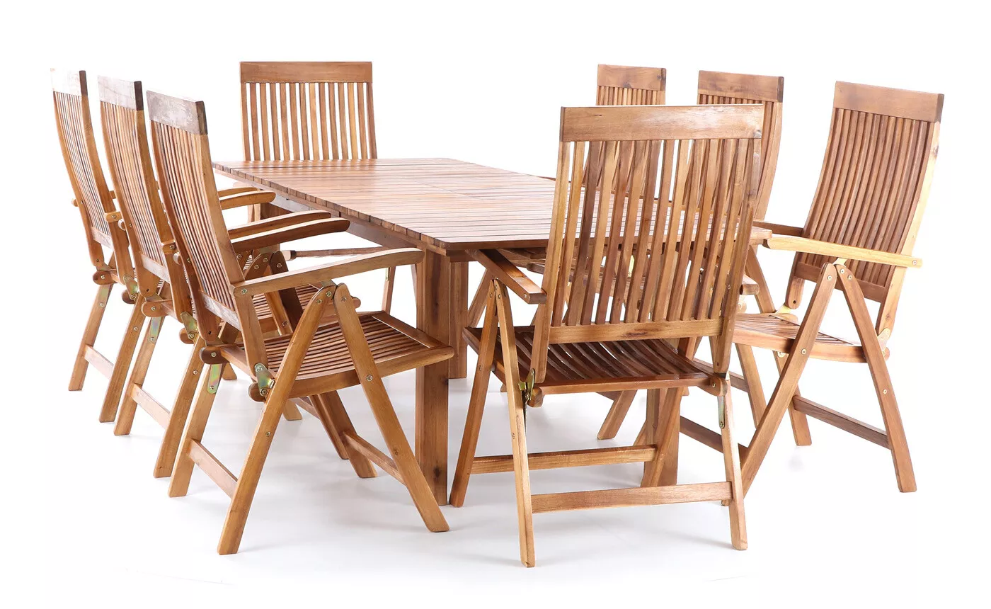 - Luxusní masivní dřevěný zahradní nábytek TORINO VeGA set 8 se skládá z osmi polohovatelných křesel a obdélníkového stolu z exotického, velice trvanlivého a tvrdého dřeva akácie.