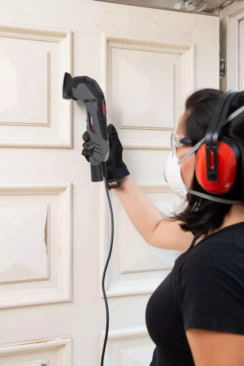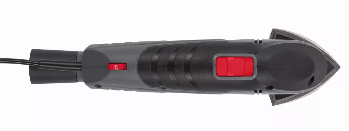 - Jeho trojúhelníková brusná základna je vybavena systémem suchého zipu, který umožňuje rychlou a snadnou výměnu brusného papíru.