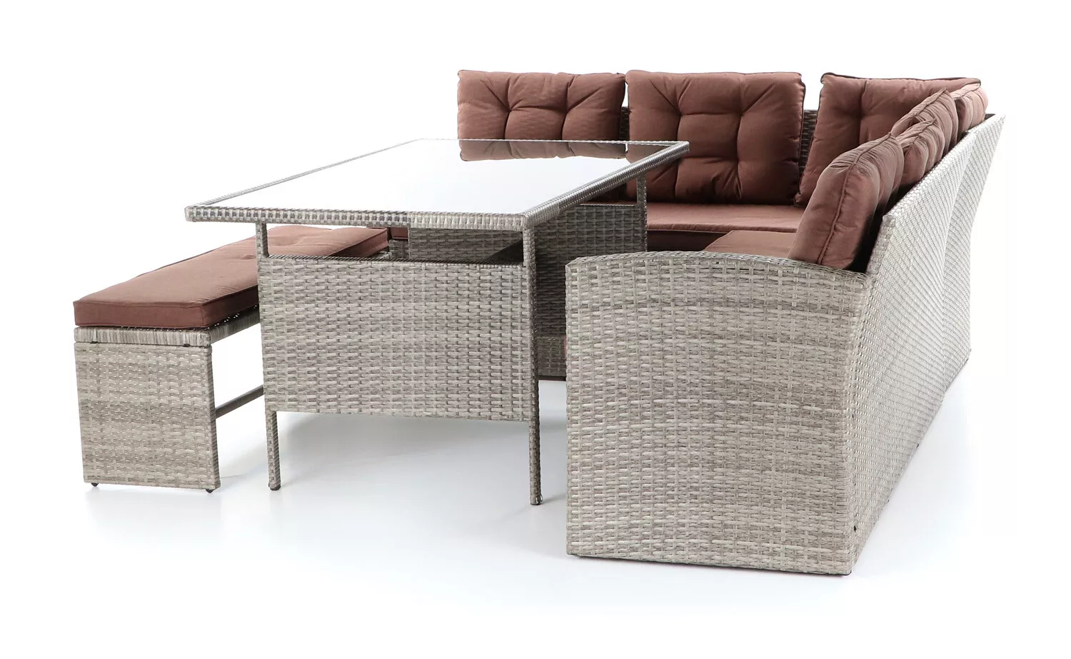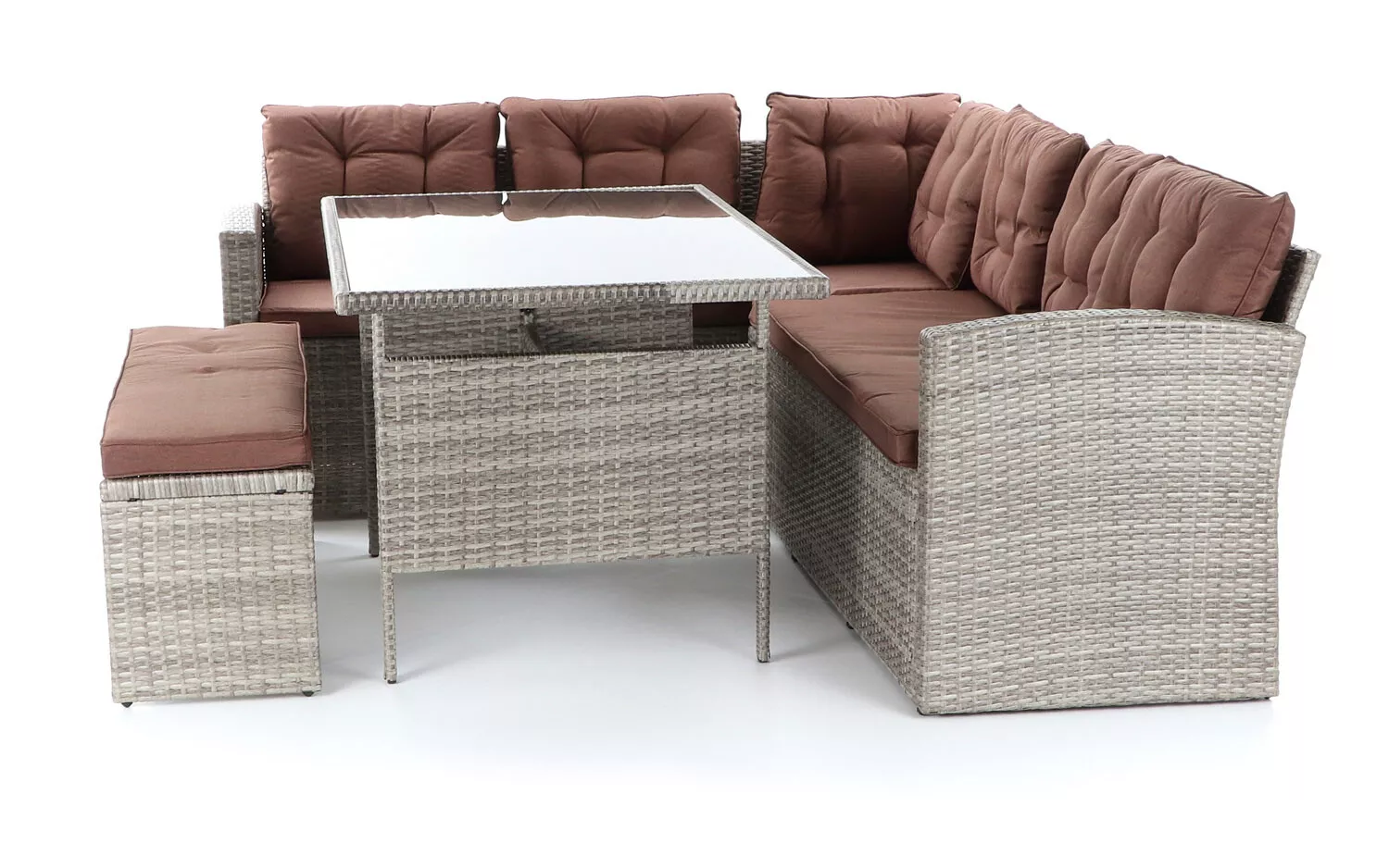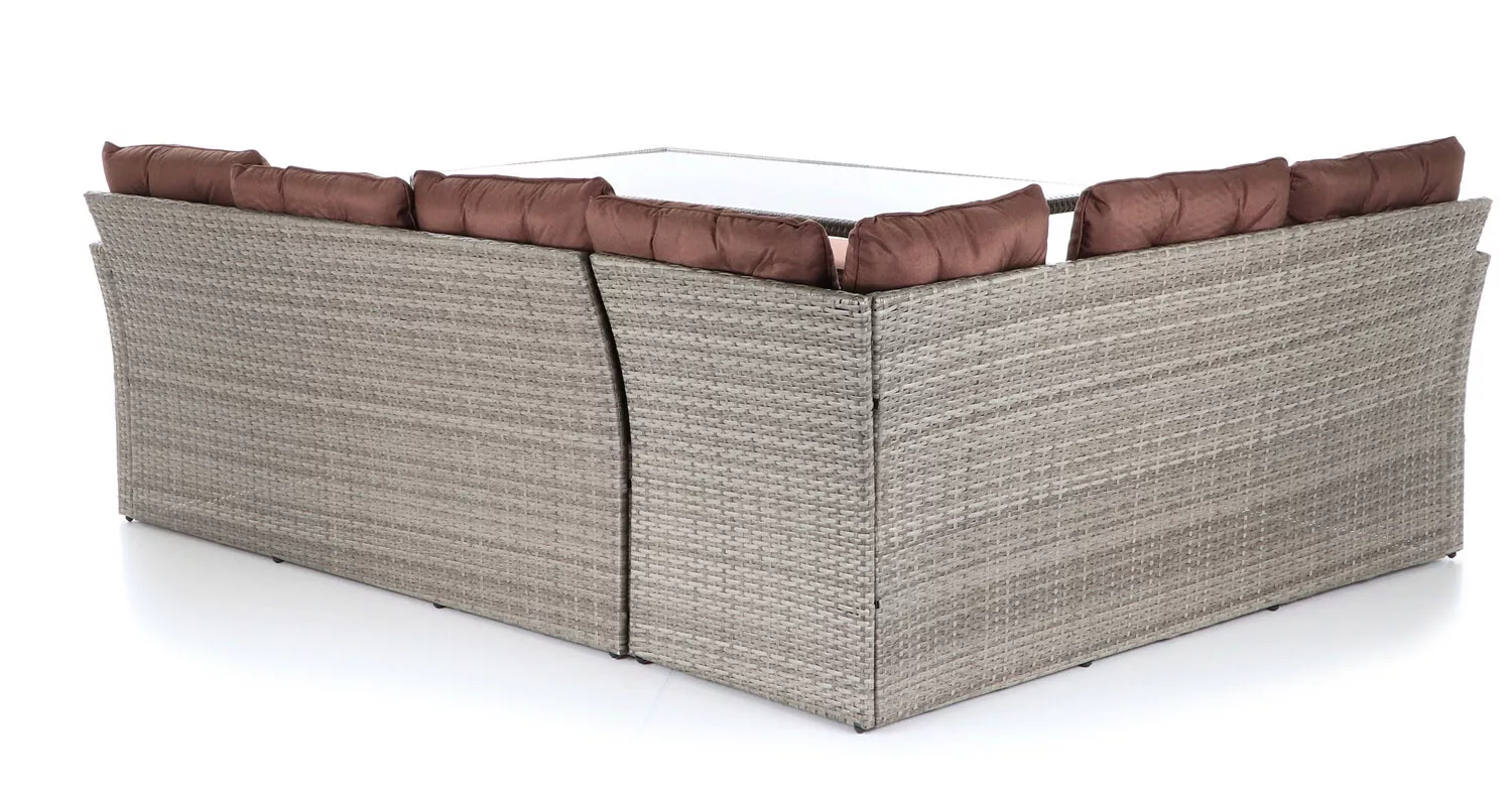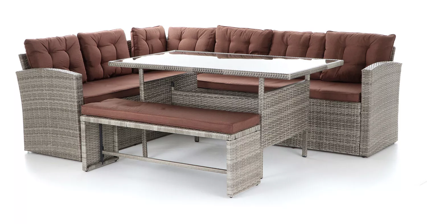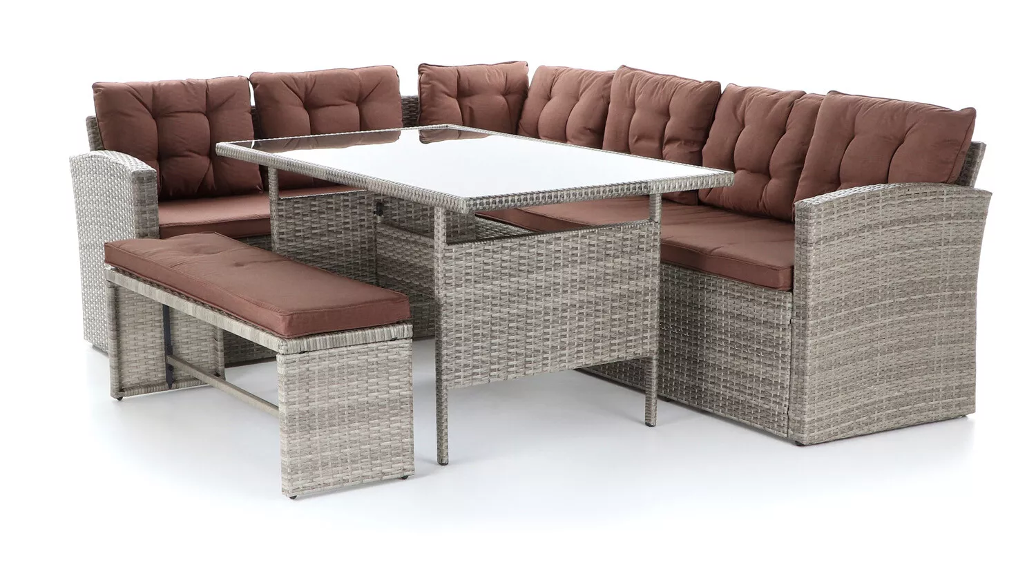 - Luxusní rohová zahradní sestava s jídelním stolem určena k příjemnému posezení při relaxu s přáteli na terase či zimní zahradě.