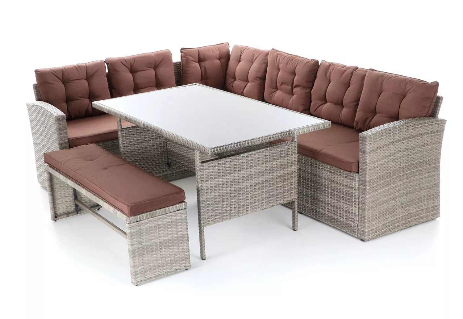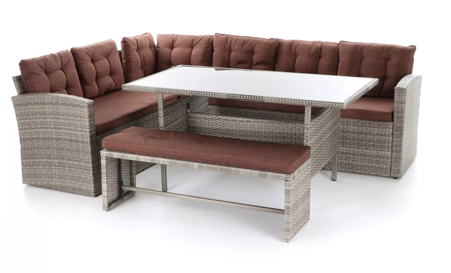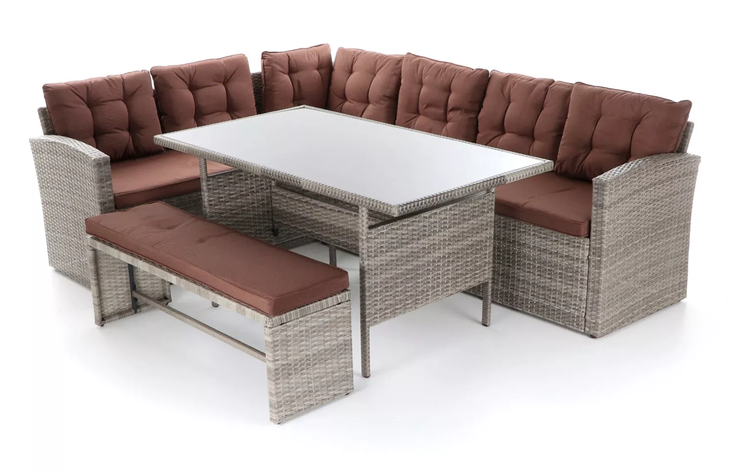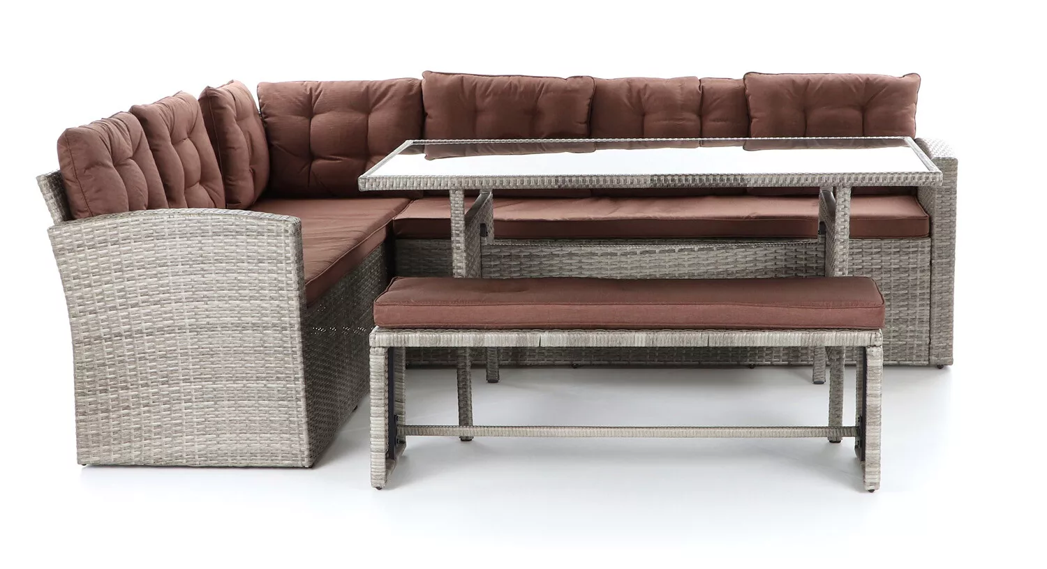 - Luxusní rohová zahradní sestava s jídelním stolem určena k příjemnému posezení při relaxu s přáteli na terase či zimní zahradě.