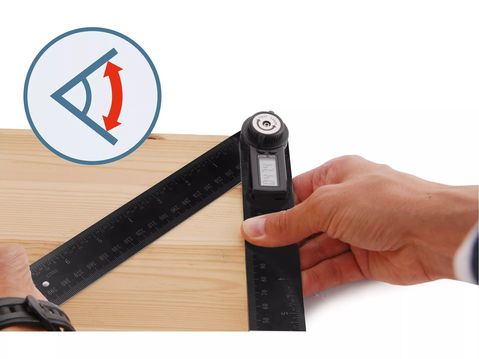 - Doplňující parametr: s pravítkem, rozsah měření 0°-360°, přesnost ±0,3°, rozlišení 0,1°, pravítko 400mmx35mm, LCD displej, baterie 3V typ CR2032, možnost zajištění v určitém úhlu, použití k měření úhlů nebo jako pravítko