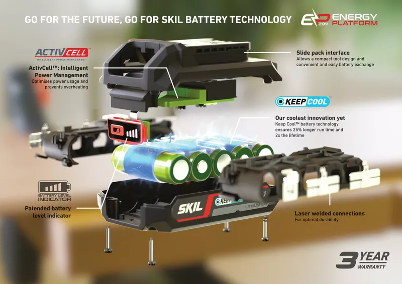 - SKIL 3920 CA se dodává bez akumulátoru.Toto nářadí je součástí „Energy Platform“ SKIL: systém flexibilních akumulátorů.