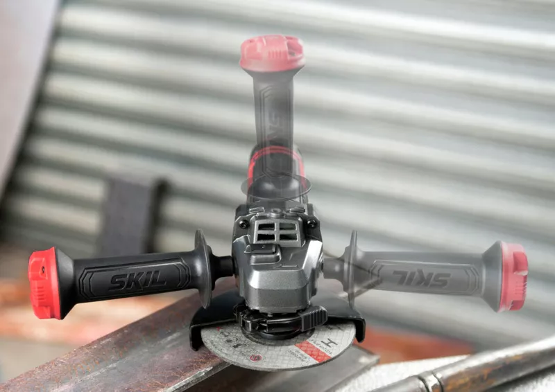 - V postranní rukojeti této úhlové brusky je vestavěné protizávaží, které se může pohybovat všemi směry.