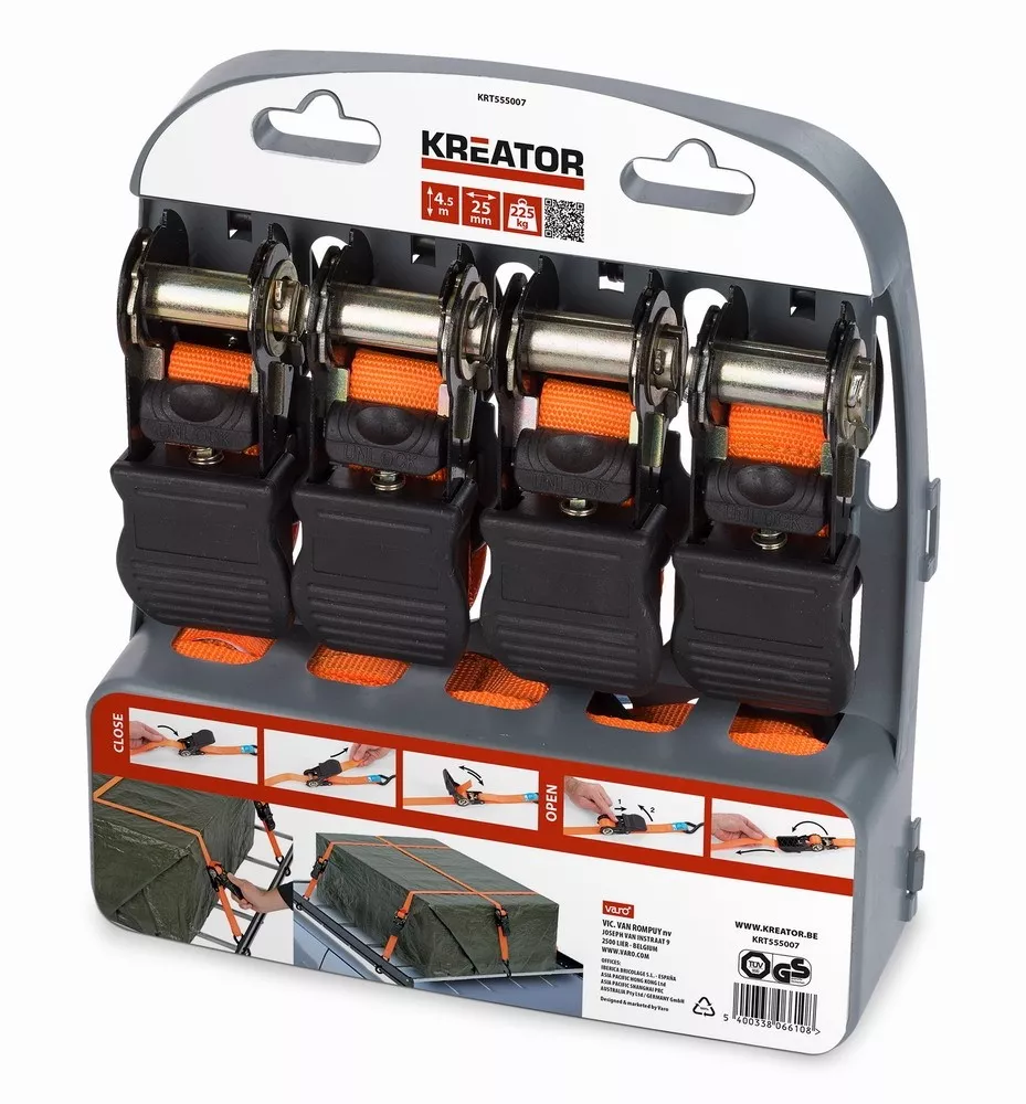 Upínací pás ráčnový s háky 225kg/4,5m 4ks Kreator KRT555007