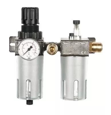- Obsahuje regulátor tlaku s filtrem s manuálním odváděním kondenzátu, manometr, olejový přimazávač a 2 rychlospojky.