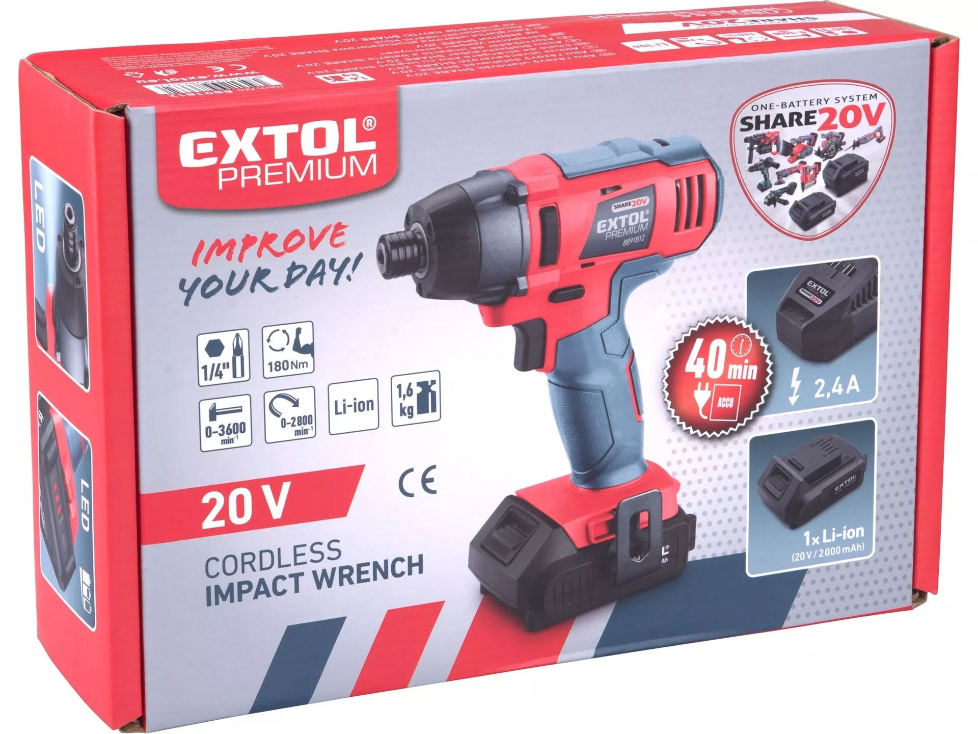 - Lehký a výkonný rázový aku utahovák s max. kroutícím momentem 180Nm Vám poskytuje výkon, který potřebujete při utahování a povolování vrutů. Rázový moment zvyšuje sílu utahováku při šroubování a zároveň snižuje spotřebu baterie při utahování. Proto je utahovák při šroubování mnohem efektivnější než aku vrtačka a také zašroubuje více vrutů na jedno nabití baterie. Dotažení vrutu usnadňuje automatické snížení rychlosti při zvýšení odporu a tření dotahovaného vrutu. Dotahování menších vrutů je díky vyšším otáčkám (2800 vs 1600/min) výrazně rychlejší než u aku vrtačky, proto je tento typ oblíbený při práci s dřevem. Hlava se šestihranným úchytem je vybavena zámkem pro bity a držáky bitů s drážkou. Celokovová převodovka zajišťuje bezchybný chod při i vysoké zátěži a přispívá k lepšímu odvodu tepla vznikajícího při práci. Utahovák je vybaven LED svítilnou, která osvětluje pracovní prostor při práci. Díky nízké hmotnosti 1,6kg s baterií lze utahovák používat i při delších pracích. Pro běžnou práci dostačují jeden nebo dva 2000mAh akumulátory, které můžete rychle nabít v rychlonabíječce, pro náročnější nebo delší práci doporučujeme větší akumulátory s kapacitou 4000–8000mAh. Akumulátor má indikátor nabití a lze použít ve všech typech nářadí řady EXTOL SHARE20V. Díky použité Li-ion technologii je ho možné kdykoliv dobíjet, aniž by se tím snižovala jeho kapacita. Li-ion akumulátor ztrácí energii vlivem samovybíjení velmi pomalu a vydrží dlouho nabitý a připravený k použití.