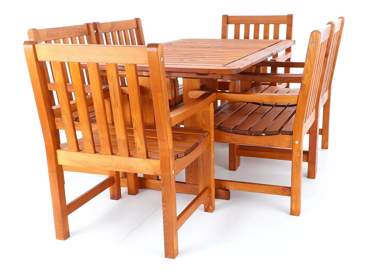 - VeGA COTSWOLD set 6 patří do značkové kolekce vyrobené z nejkvalitnější severské borovice. Nábytek je povrchově upraven speciální lazurou. Vzhledem k tomu, že nábytek je vyroben z přírodního materiálu, je kresba dřeva a jeho zbarvení na každém kusu nábytku unikátní. Dřevo severské borovice se ošetřuje lazurou na vodní bázi, která ho chrání před vysušením, vodou, škůdci nebo drobným poškozením.Nábytek VeGA COTSWOLD set 6 je vyroben ze severské borovice, která je žádaným materiálem pro výrobu zahradního nábytku. Tato dřevina našla své uplatnění jak v interiéru pro svůj dekorativní vzhled (má unikátní barvu, díky které na každém kusu nábytku dokonale vynikne kresba dřeva), ale především v exteriéru na výrobu zahradního nábytku, oken a dveří pro svoji vynikající odolnost, trvanlivost, dlouhou životnost a dobrou opracovatelnost.Zahradní nábytek VeGA COTSWOLD set 6 se vyznačuje atraktivním designem, robustní a ergonomickou konstrukcí a pečlivým zpracováním.Stůl a křesla jsou dodávány v rozebraném stavu a jsou pečlivě zabaleny do kartonů. Součástí dodávky je potřebný spojovací materiál, kování, imbusový nebo stranový klíč a jednoduchý montážní návod - montáž je snadná.Pokud chcete mít skutečně luxusní masivní zahradní nábytek a ohromit známé, přátele nebo i rodinu, zvolte sestavu VeGA COTSWOLD. Tato sestava ze severské borovice Vás na první pohled upoutá svou atraktivní medově kapučínovou barvou a unikátní kresbou dřeva. Vyznačuje se velkou odolností a dlouhou životností. Nábytek ze severské borovice se nemusíte bát nechat ve venkovním prostředí, protože je při použití vhodné impregnace odolný proti povětrnostním podmínkám. A pokud o něj budete i náležitě pečovat, bude Vám sloužit spousty let.