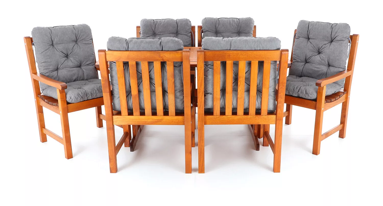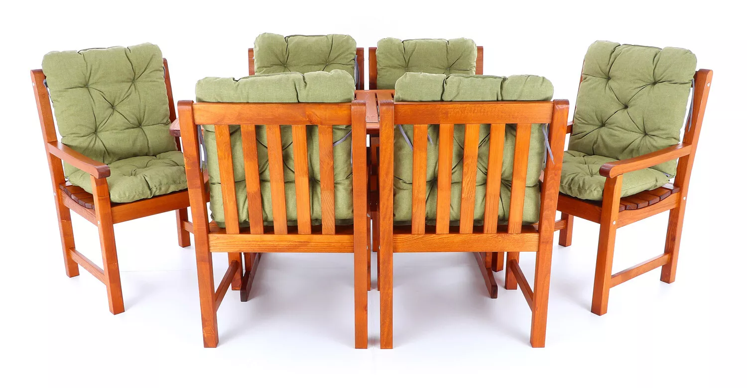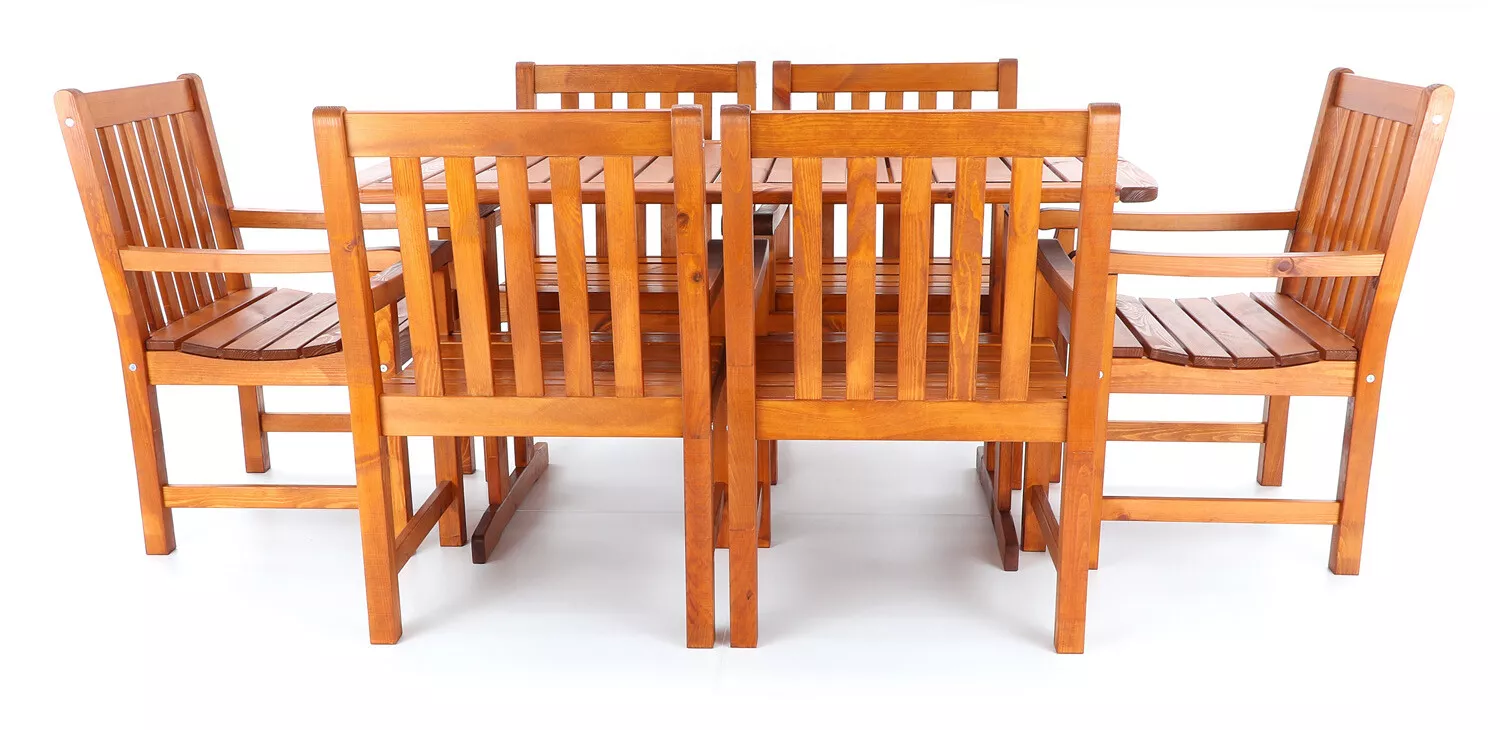 - Luxusní masivní stolová sestava šesti křesel a stolu z odolného a trvanlivého dřeva severské borovice. Odolné dřevo a velmi robustní konstrukce řadí tuto sestavu mezi nejmasivnější výrobky ve své kategorii na trhu.