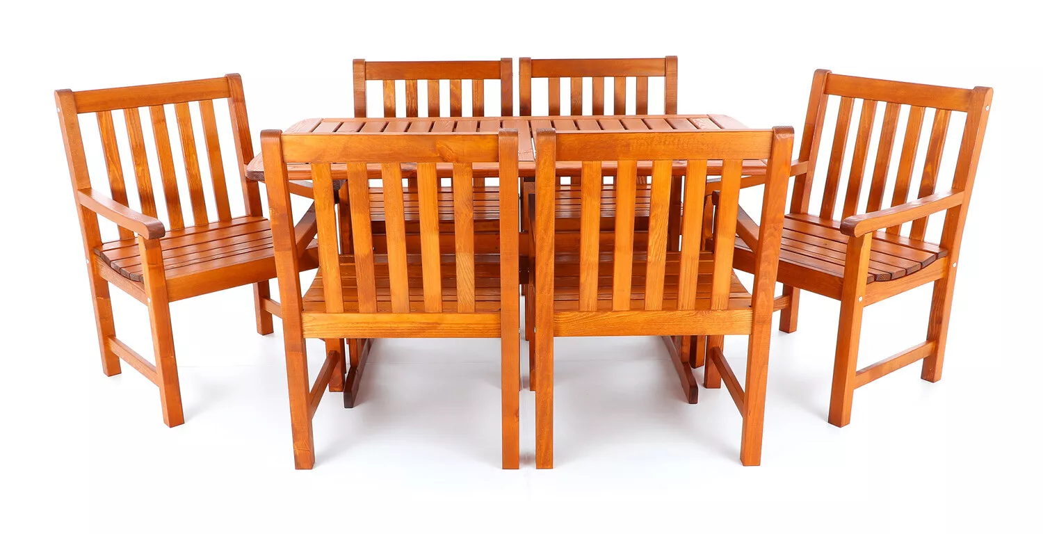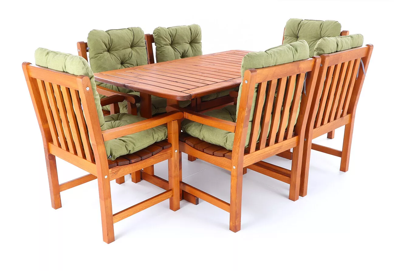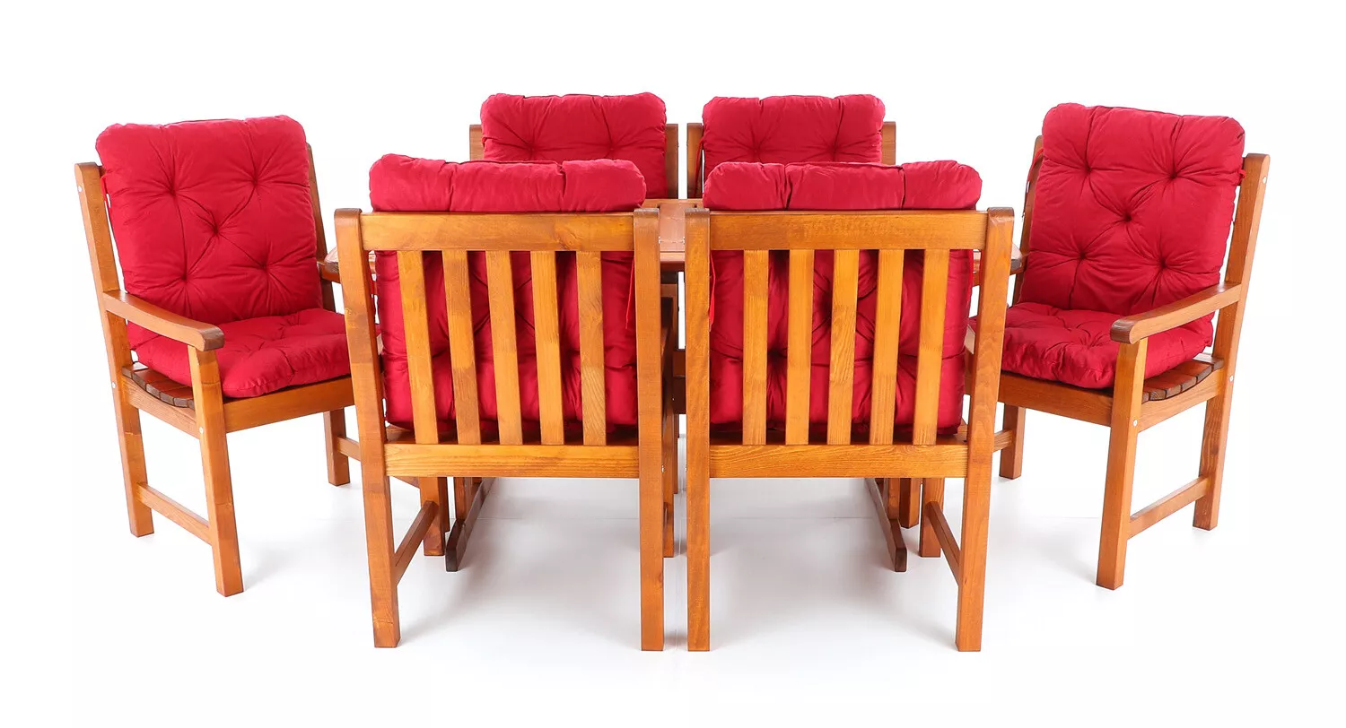 - Luxusní masivní stolová sestava šesti křesel a stolu z odolného a trvanlivého dřeva severské borovice. Odolné dřevo a velmi robustní konstrukce řadí tuto sestavu mezi nejmasivnější výrobky ve své kategorii na trhu.