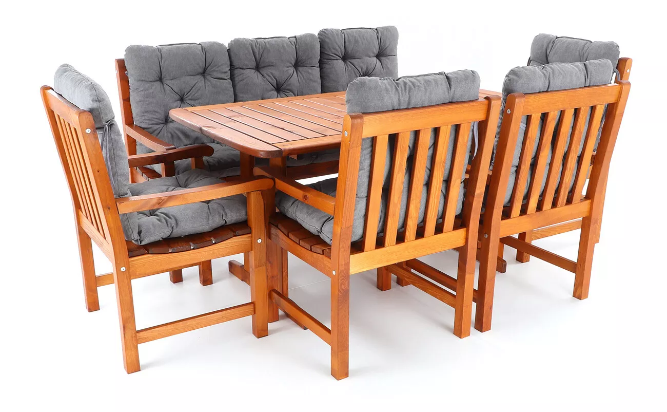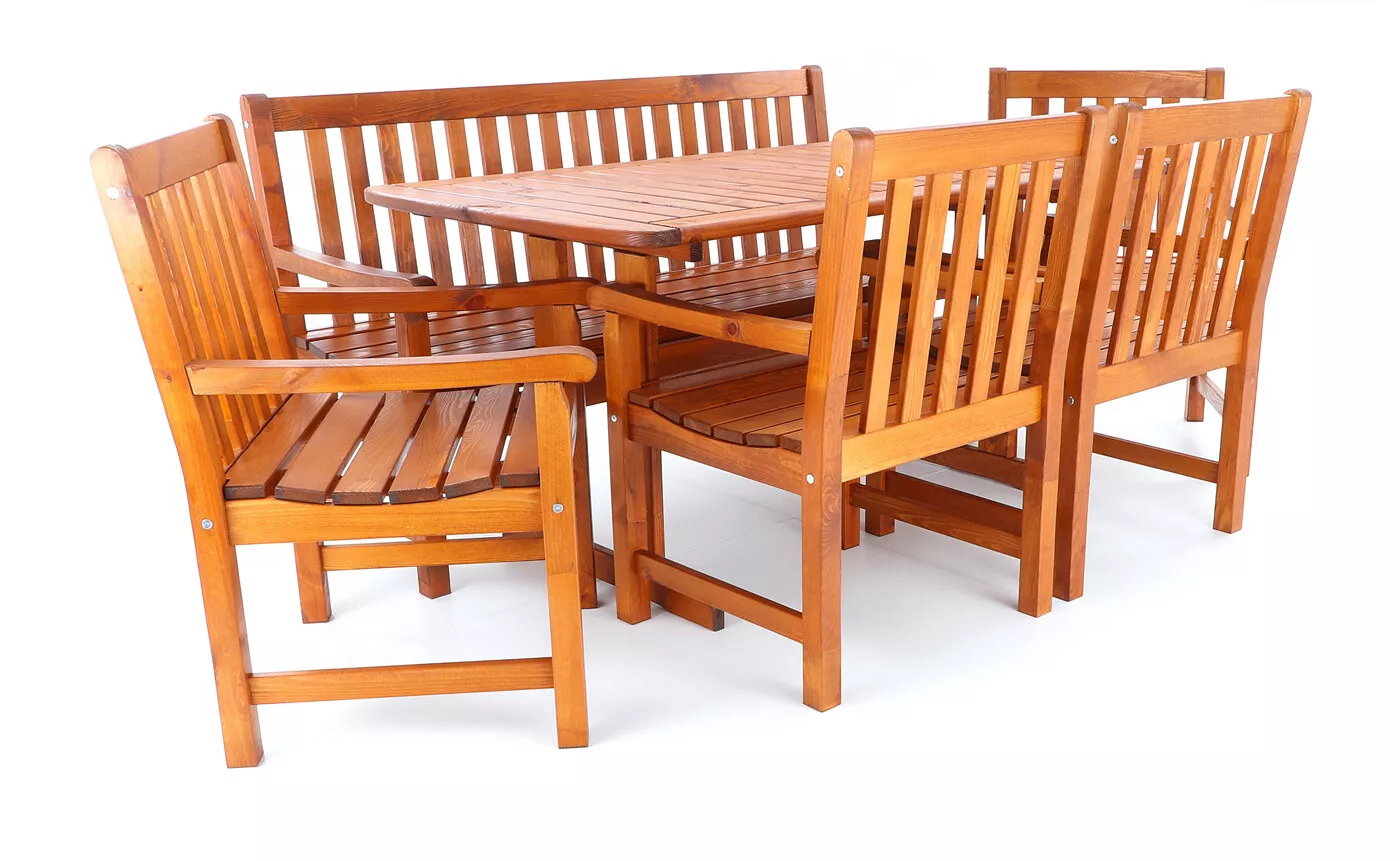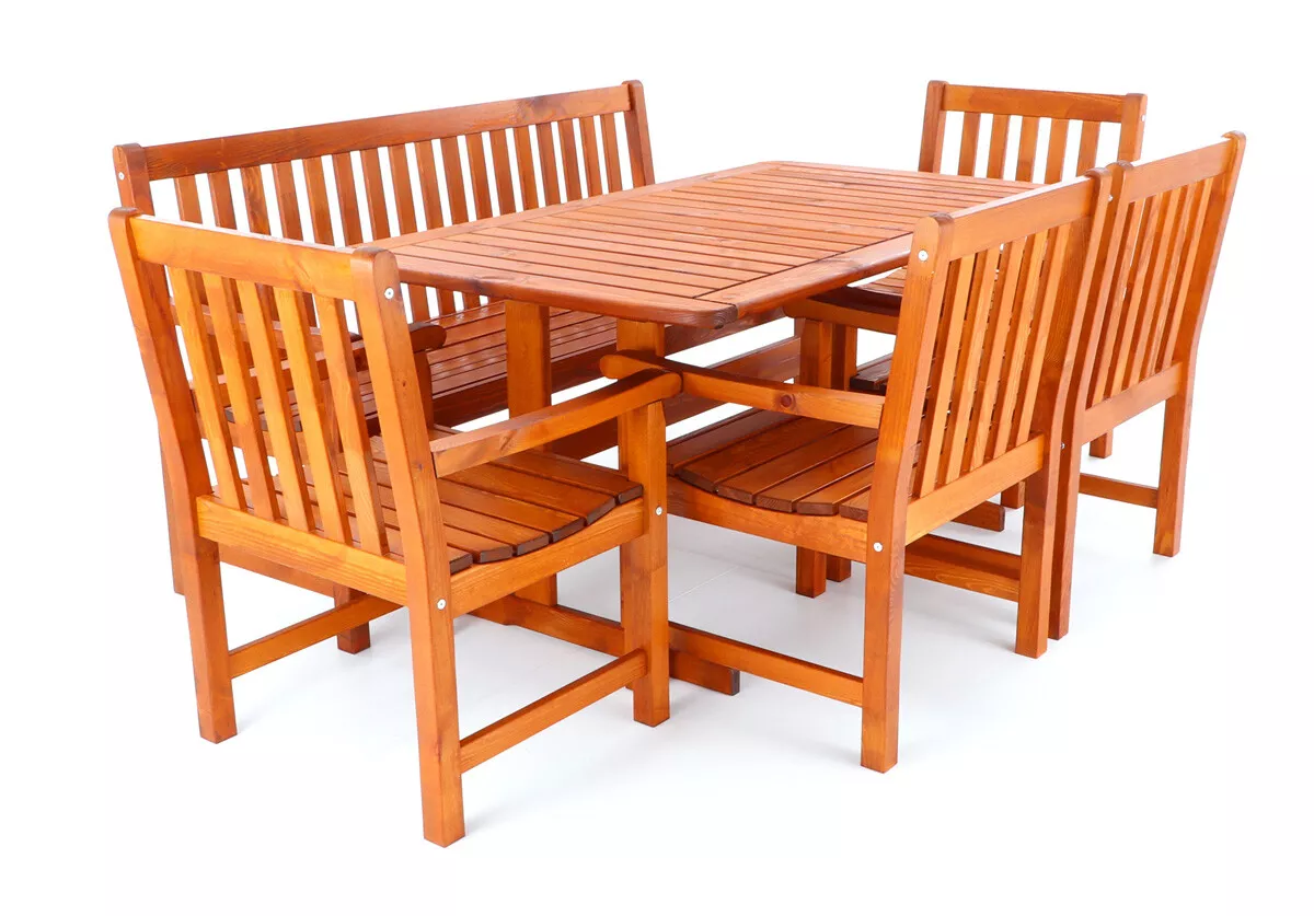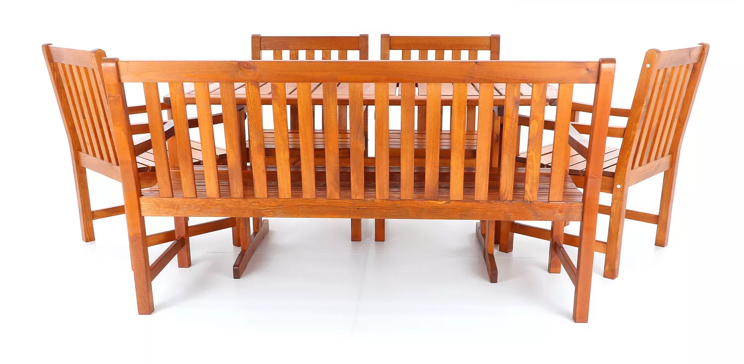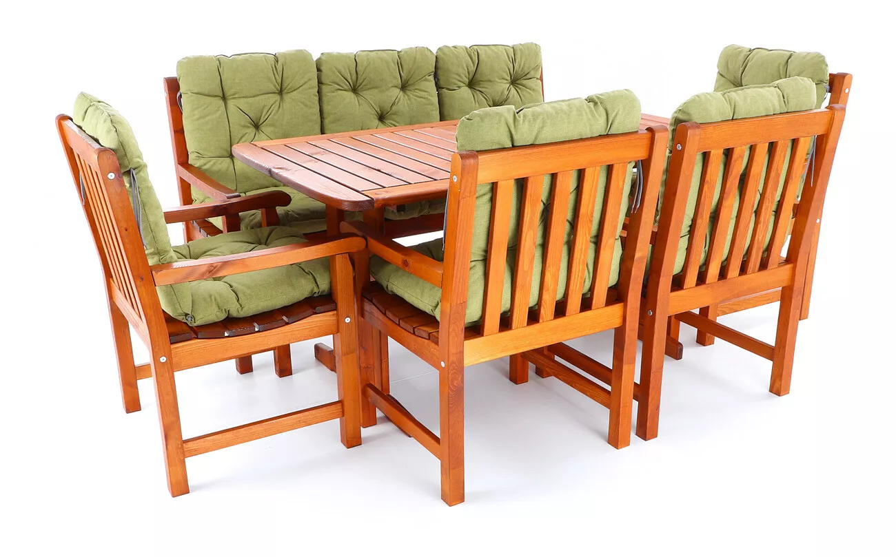 - Luxusní masivní stolová sestava čtyř křesel, jedné lavice a stolu z odolného a trvanlivého dřeva severské borovice. Odolné dřevo a velmi robustní konstrukce řadí tuto sestavu mezi nejmasivnější výrobky ve své kategorii na trhu.