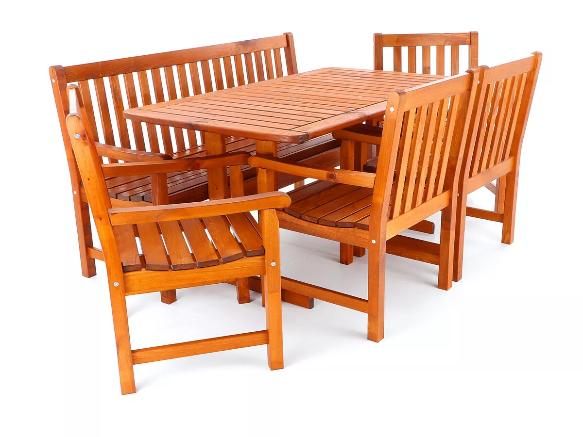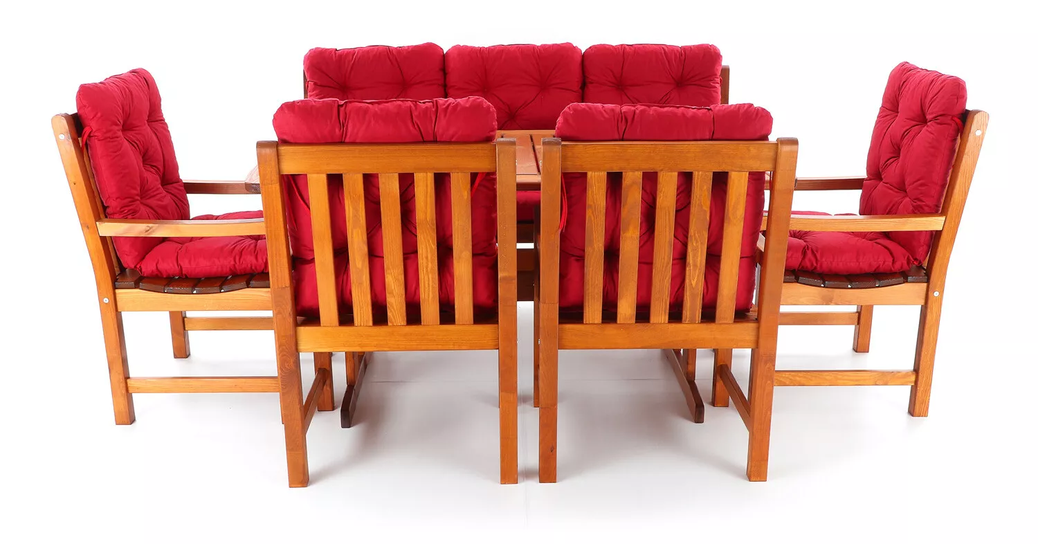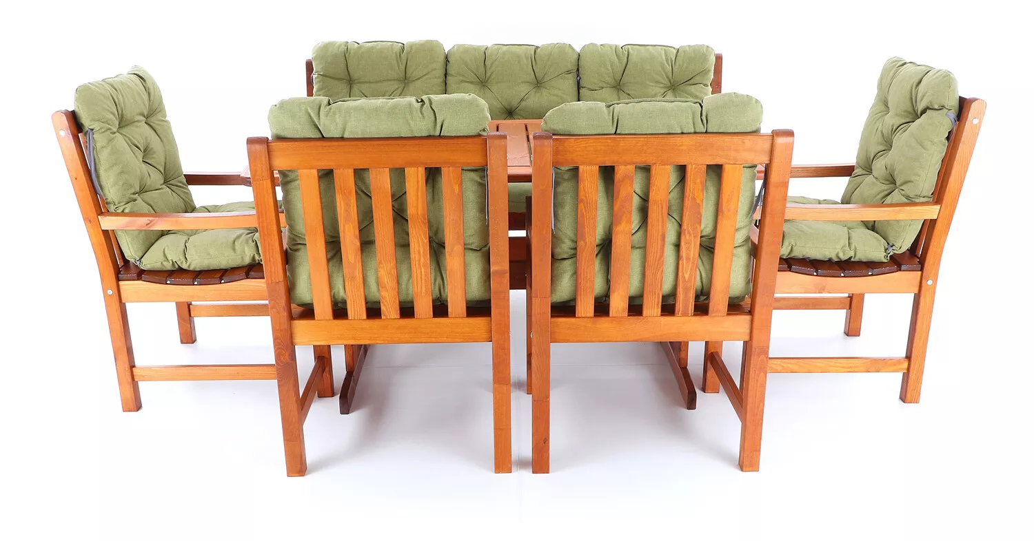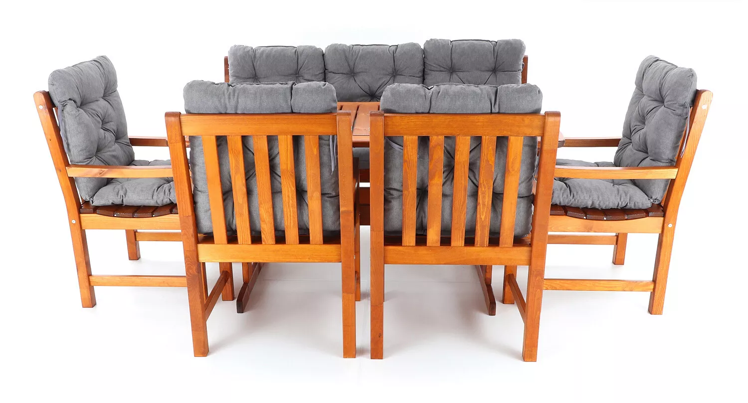 - Luxusní masivní stolová sestava čtyř křesel, jedné lavice a stolu z odolného a trvanlivého dřeva severské borovice. Odolné dřevo a velmi robustní konstrukce řadí tuto sestavu mezi nejmasivnější výrobky ve své kategorii na trhu.
