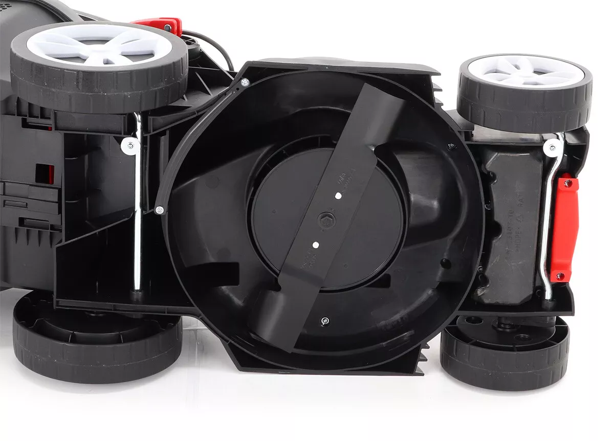 - • převod otáček pomocí malého klínového řemene výrazně zvyšuje točivý moment stroje (více síly i v hustší trávě) a při nárazu nože na překážku zabrání spálení motoru a tím pádem i drahé opravě