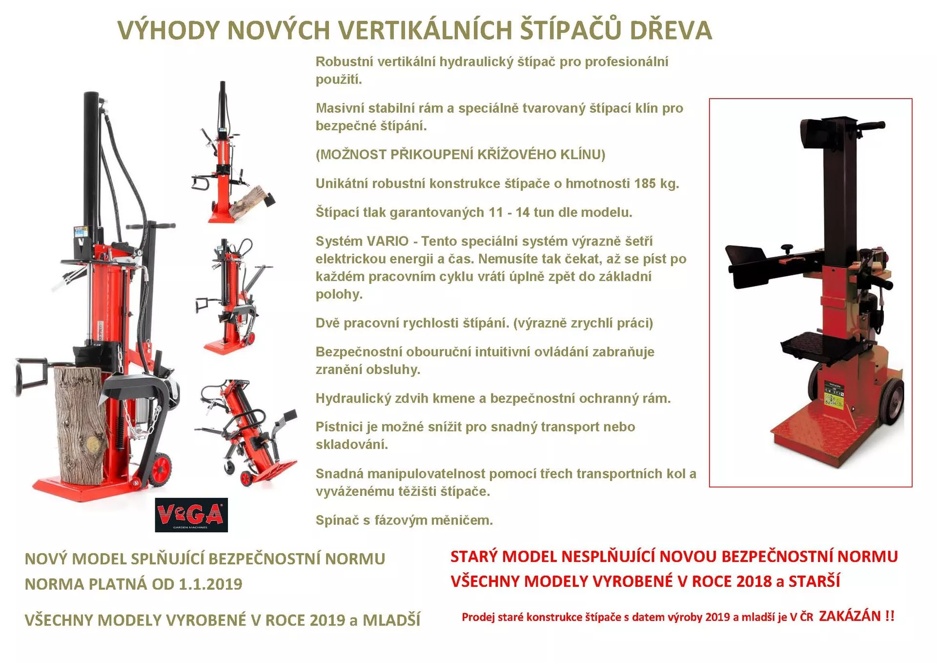 - Štípačka VeGA LV1110PRO VARIO splňuje novou normu EU pro bezpečnost práce. Ke standardnímu obouručnímu ovládání tak přibylo nové, větší ochranné rameno a transportní kolo u vodicích rukojetí pro snadný převoz štípačky. Levá ovládací páka je vybavená zařízením pro zajištění stability polena.