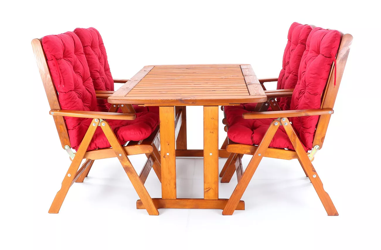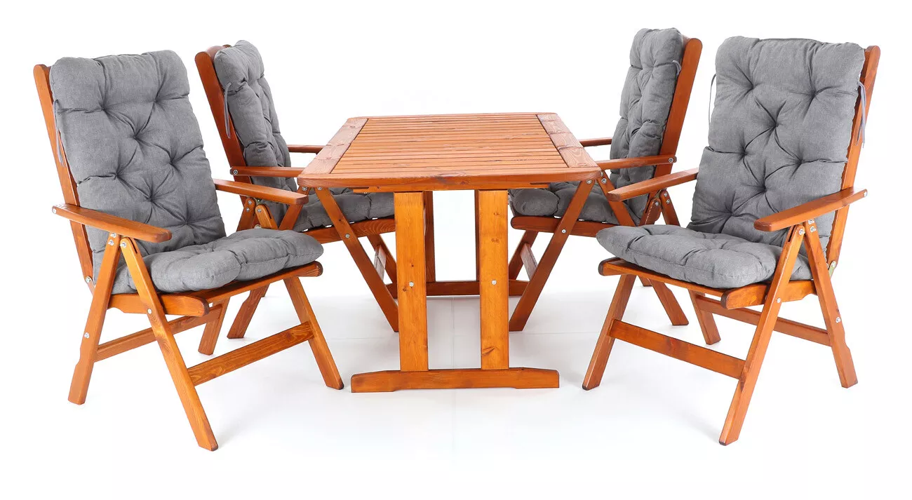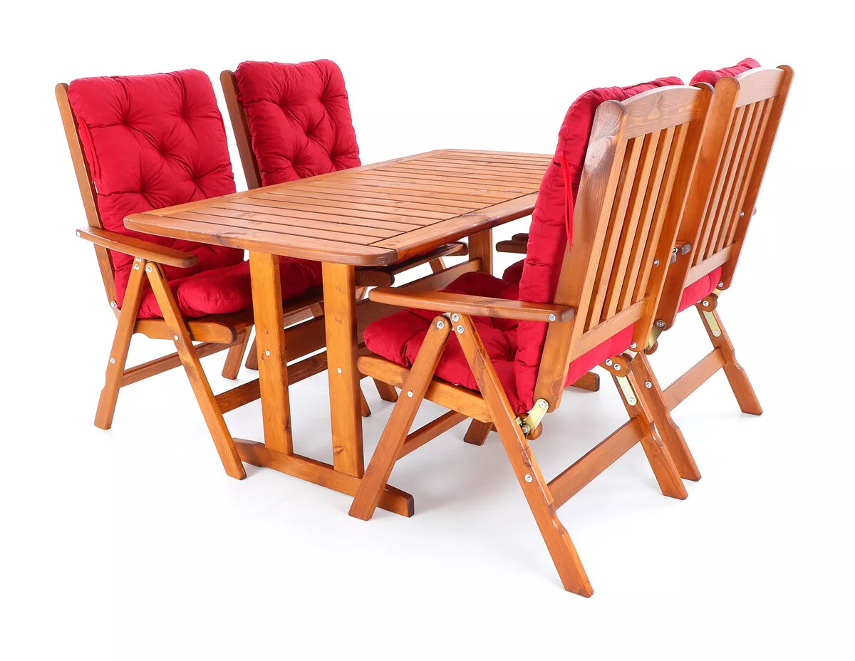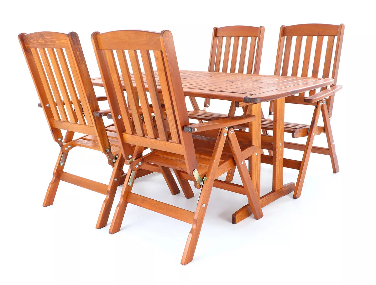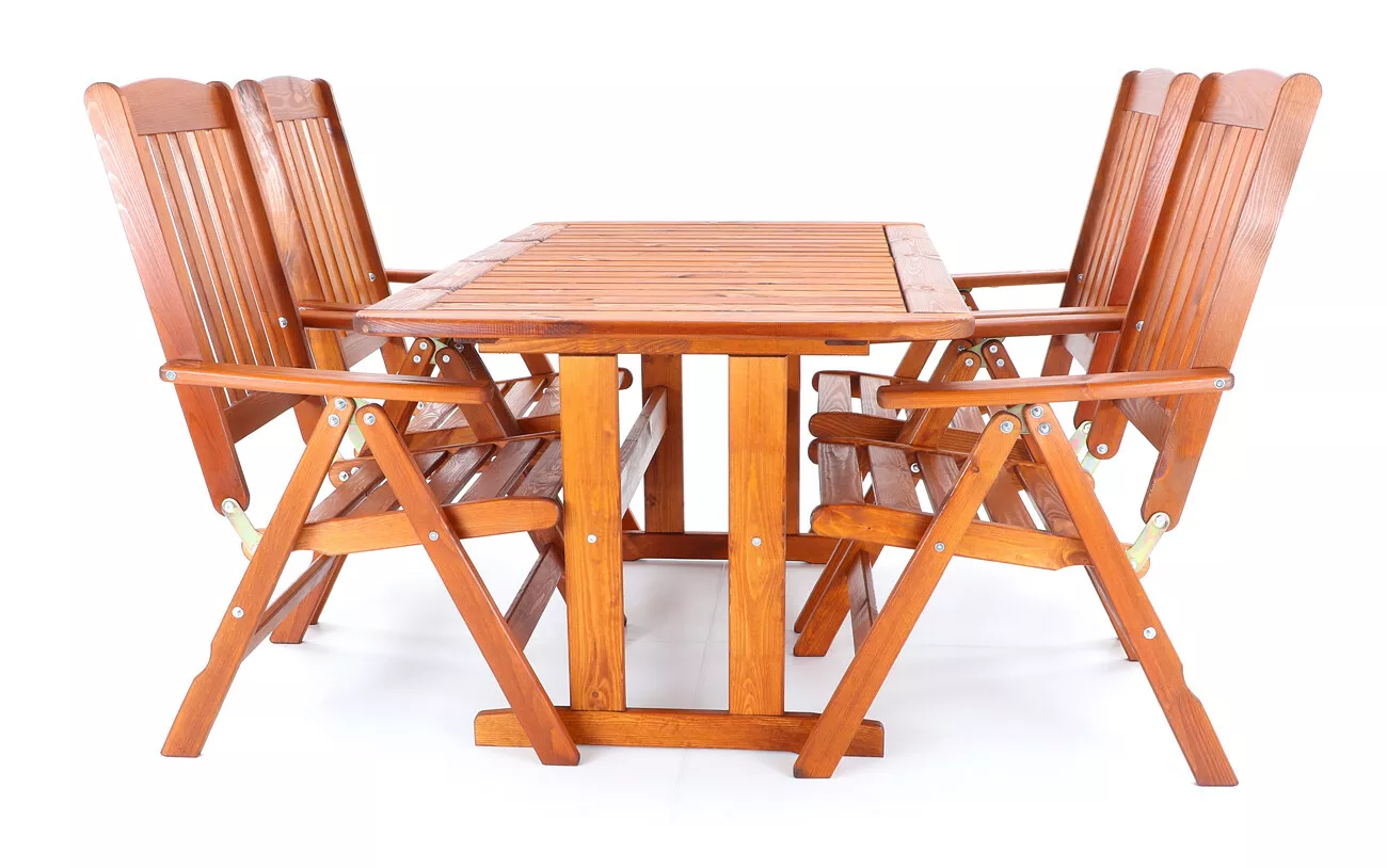 - Luxusní masivní stolová sestava čtyř polohovacích křesel a stolu z odolného a trvanlivého dřeva severské borovice. Odolné dřevo a velmi robustní konstrukce řadí tuto sestavu mezi nejmasivnější výrobky ve své kategorii na trhu.