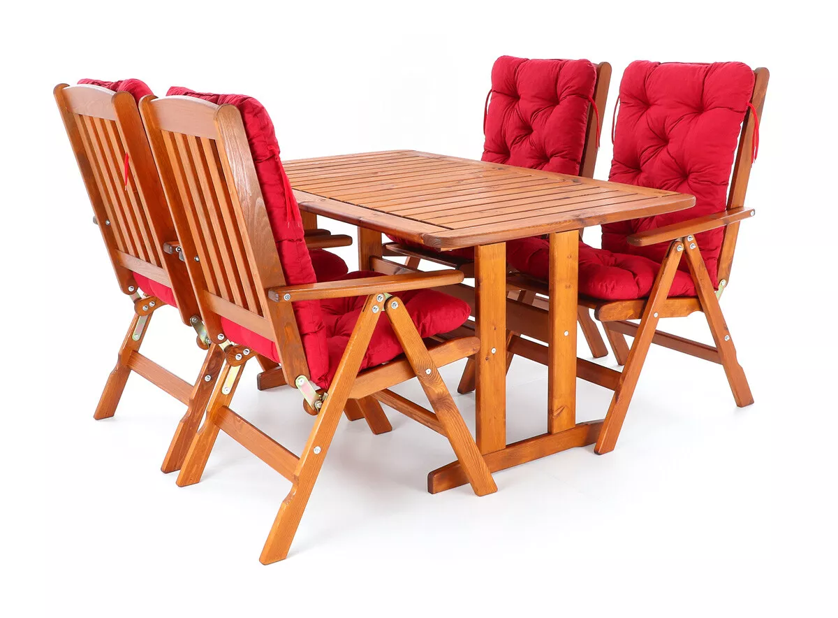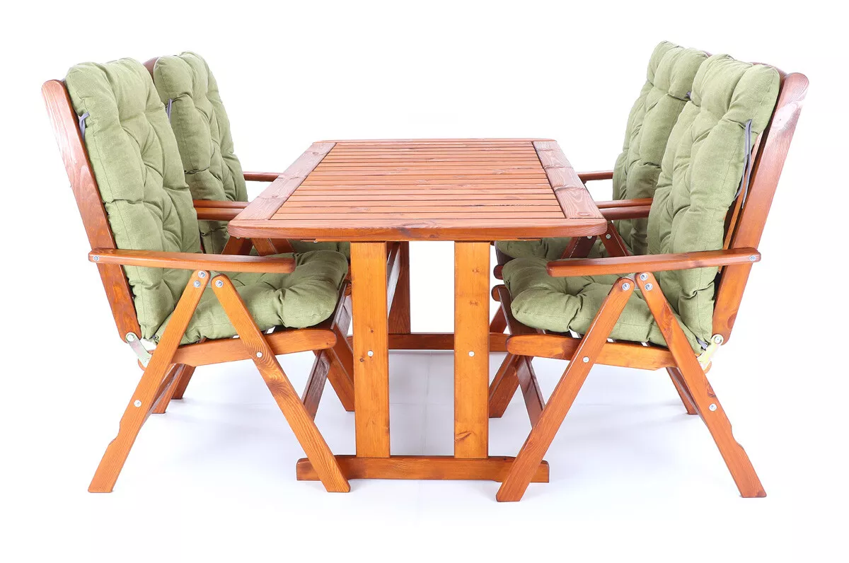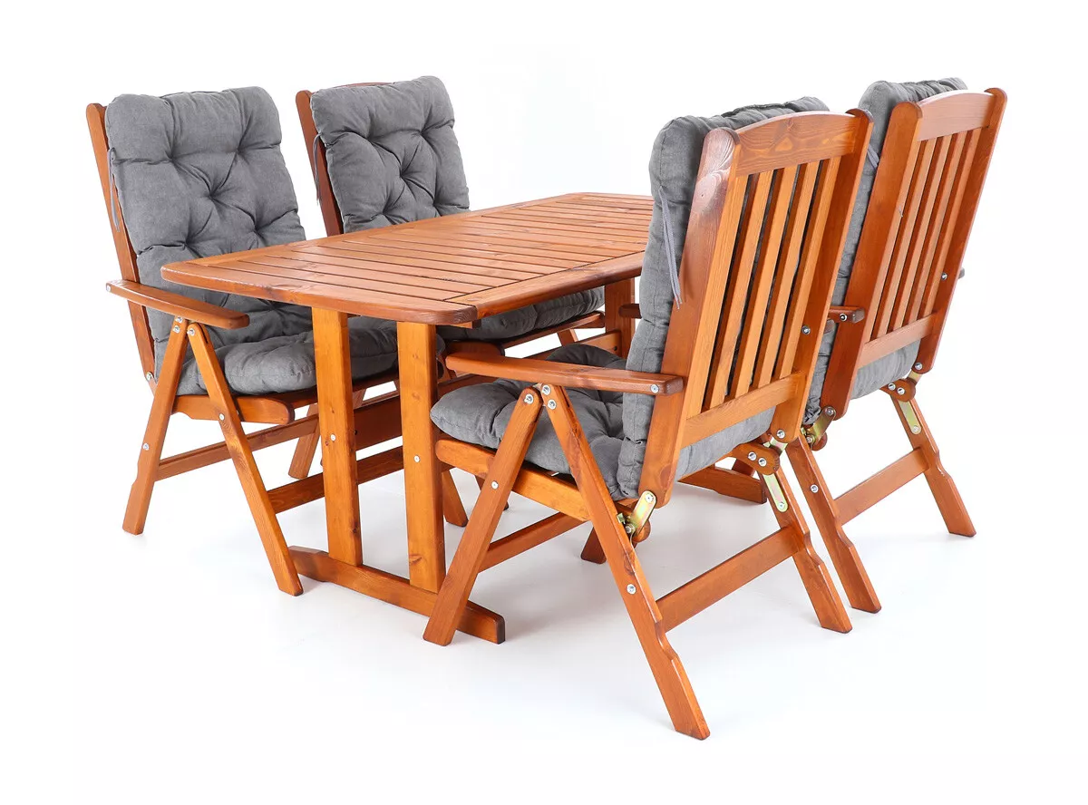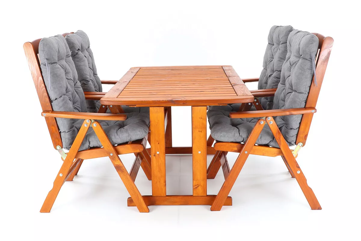 - Luxusní masivní stolová sestava čtyř polohovacích křesel a stolu z odolného a trvanlivého dřeva severské borovice. Odolné dřevo a velmi robustní konstrukce řadí tuto sestavu mezi nejmasivnější výrobky ve své kategorii na trhu.