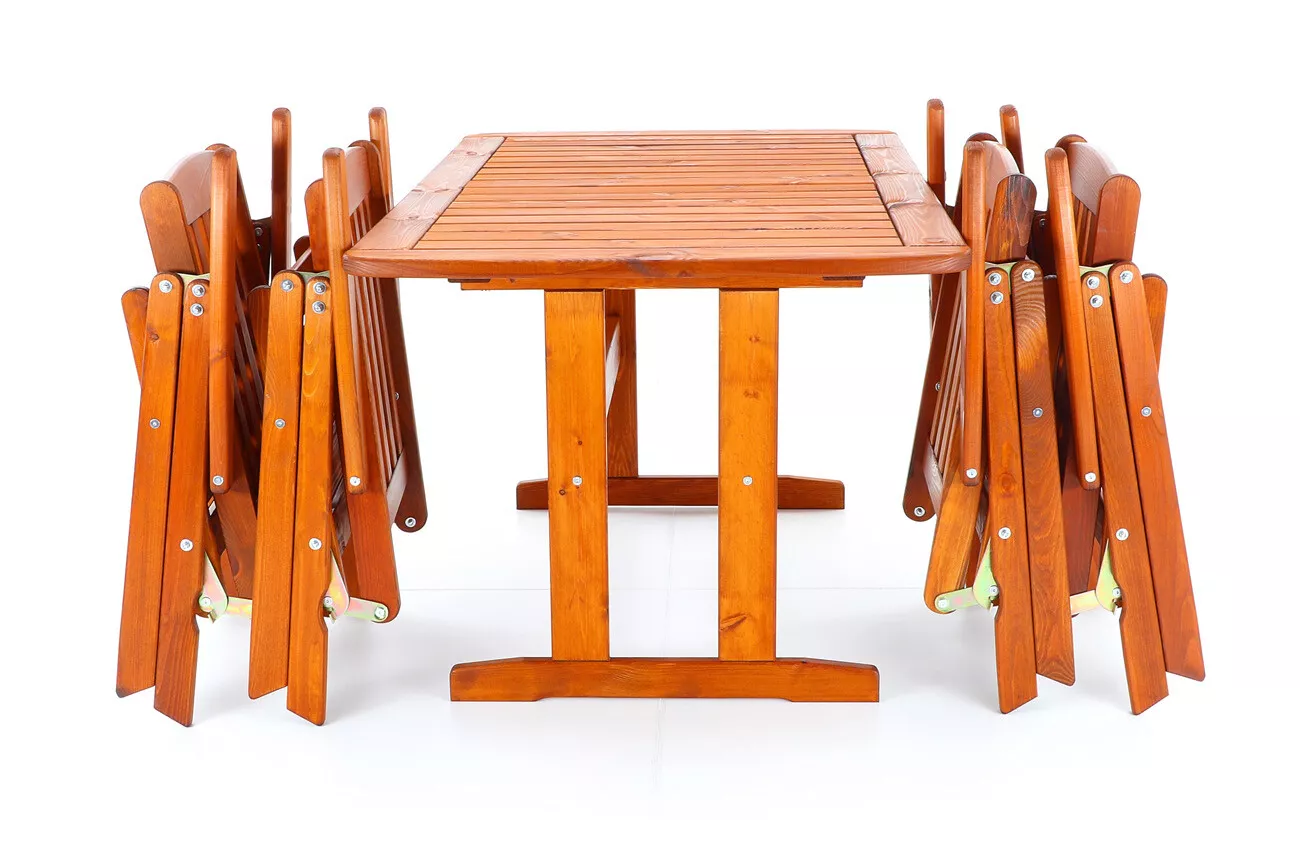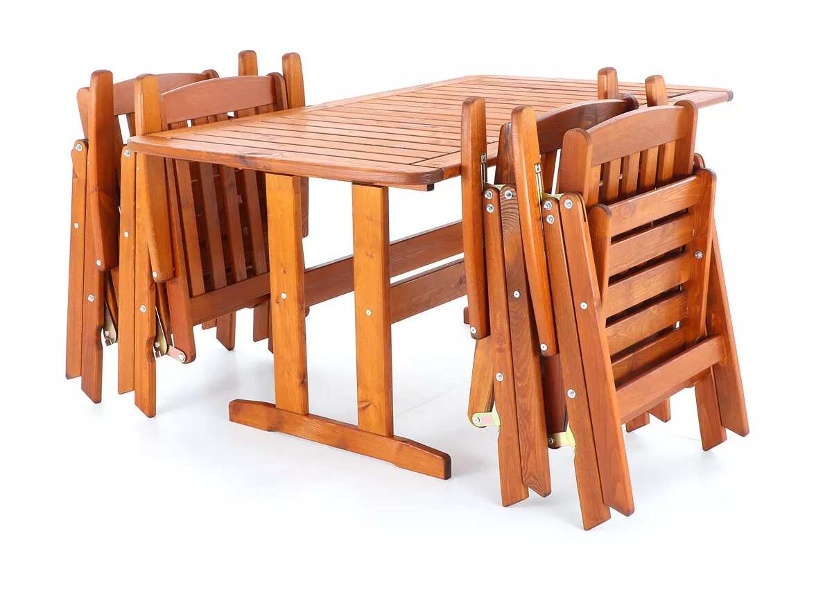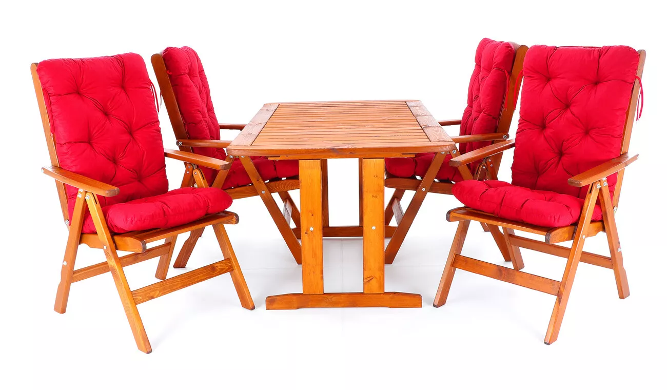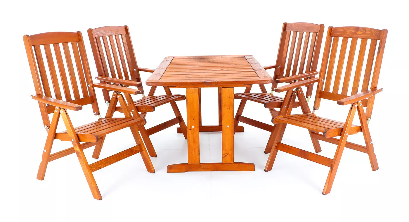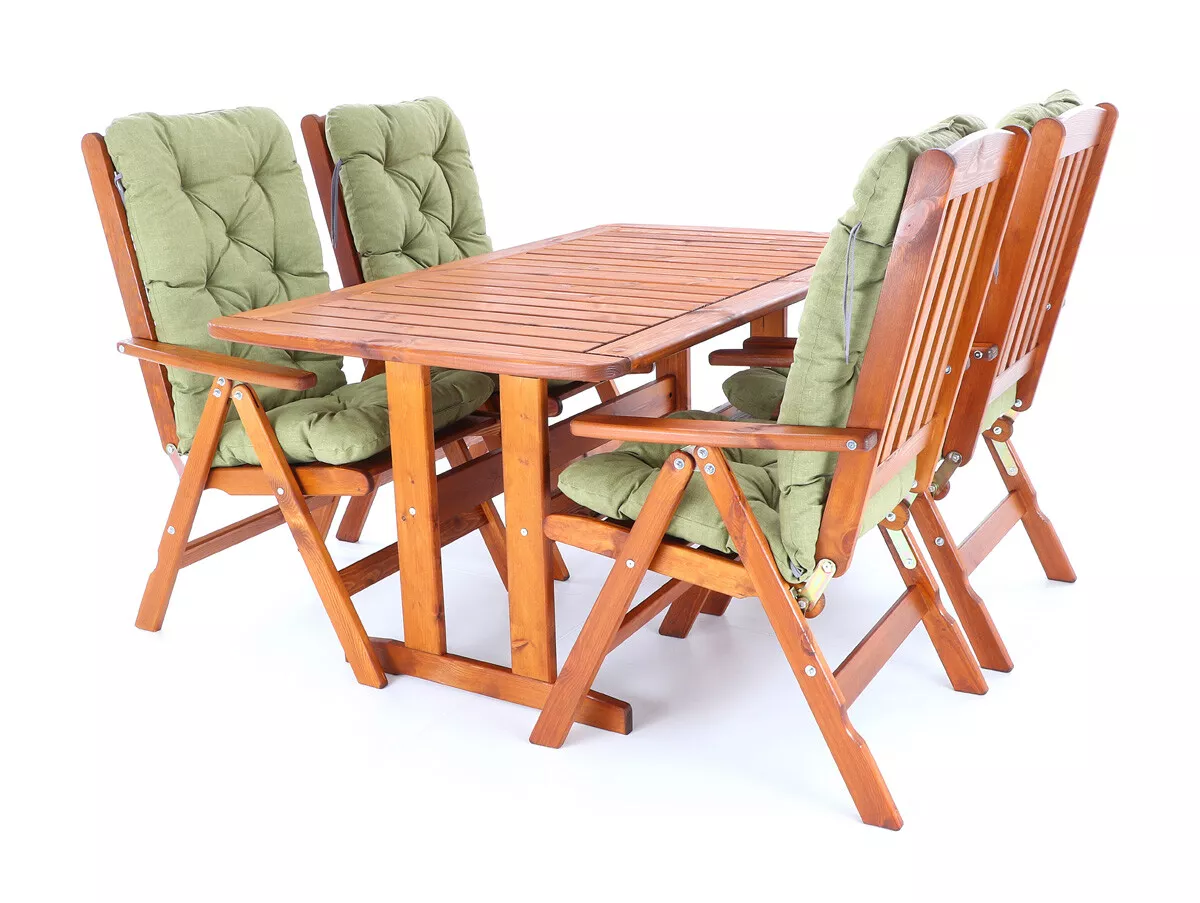 - Luxusní masivní stolová sestava čtyř polohovacích křesel a stolu z odolného a trvanlivého dřeva severské borovice. Odolné dřevo a velmi robustní konstrukce řadí tuto sestavu mezi nejmasivnější výrobky ve své kategorii na trhu.