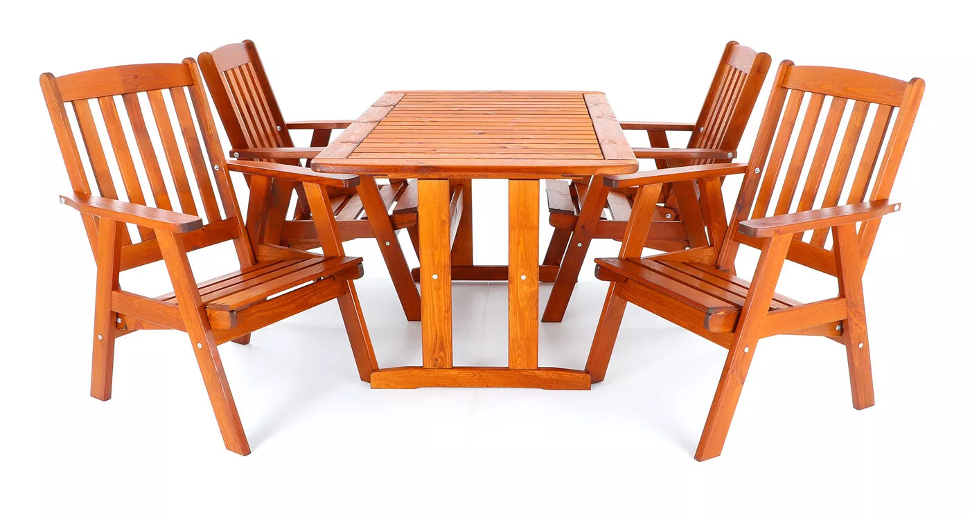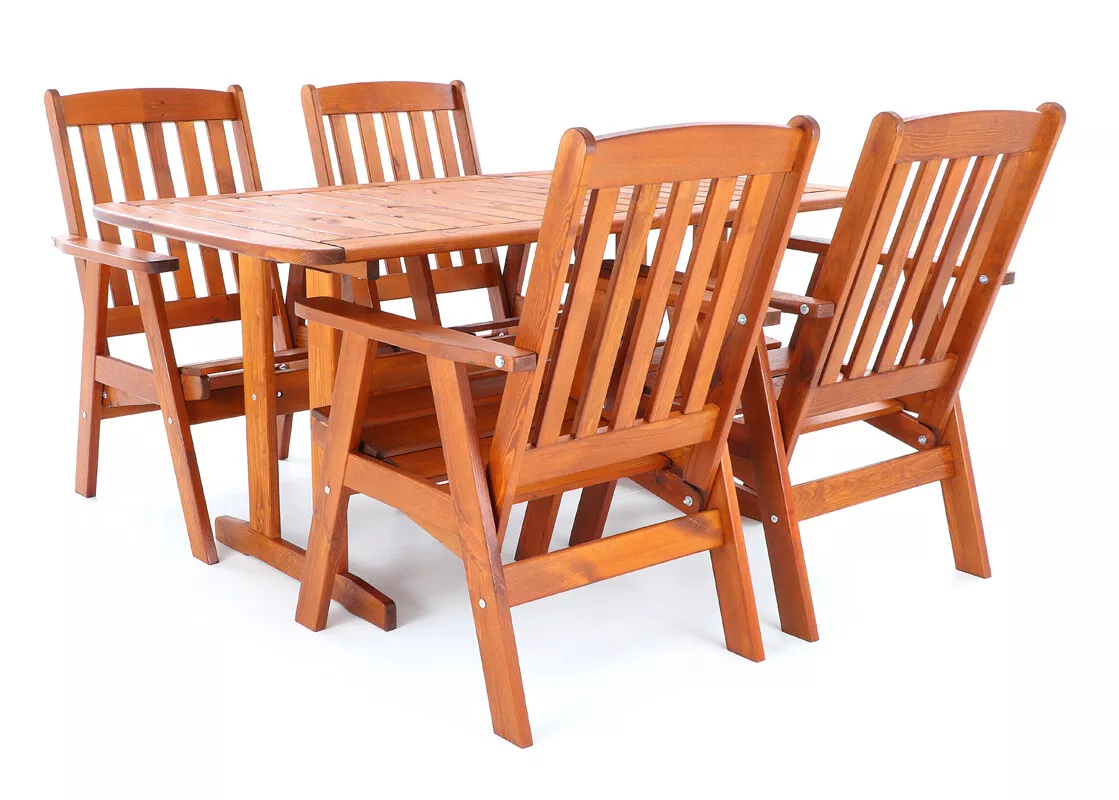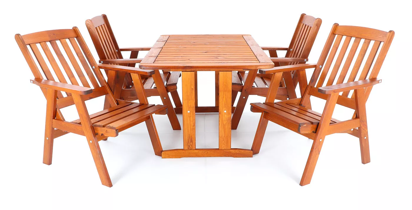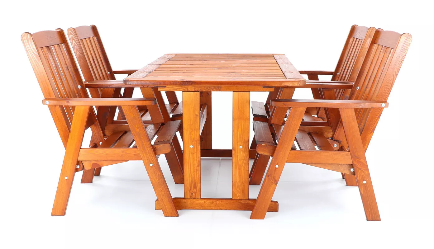 - Luxusní masivní stolová sestava čtyř polohovacích křesel a stolu z odolného a trvanlivého dřeva severské borovice. Odolné dřevo a velmi robustní konstrukce řadí tuto sestavu mezi nejmasivnější výrobky ve své kategorii na trhu.