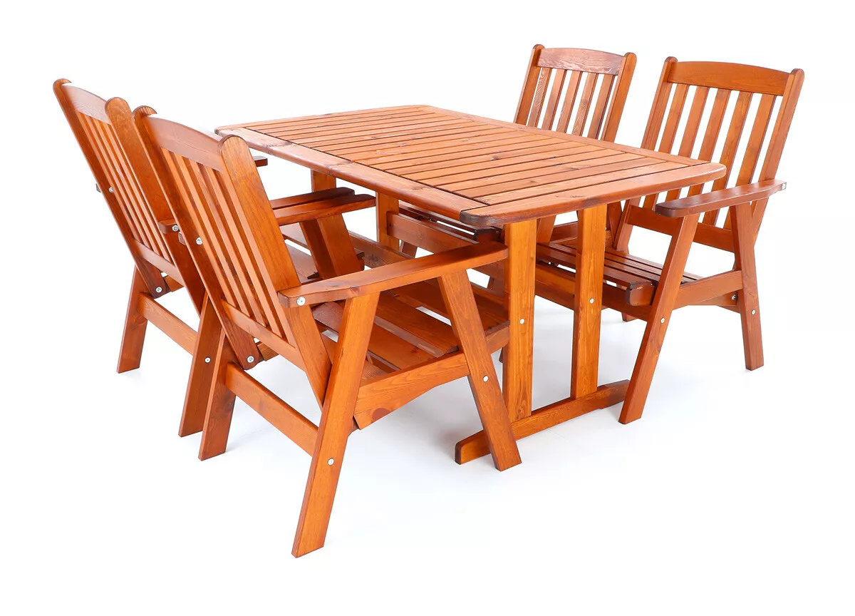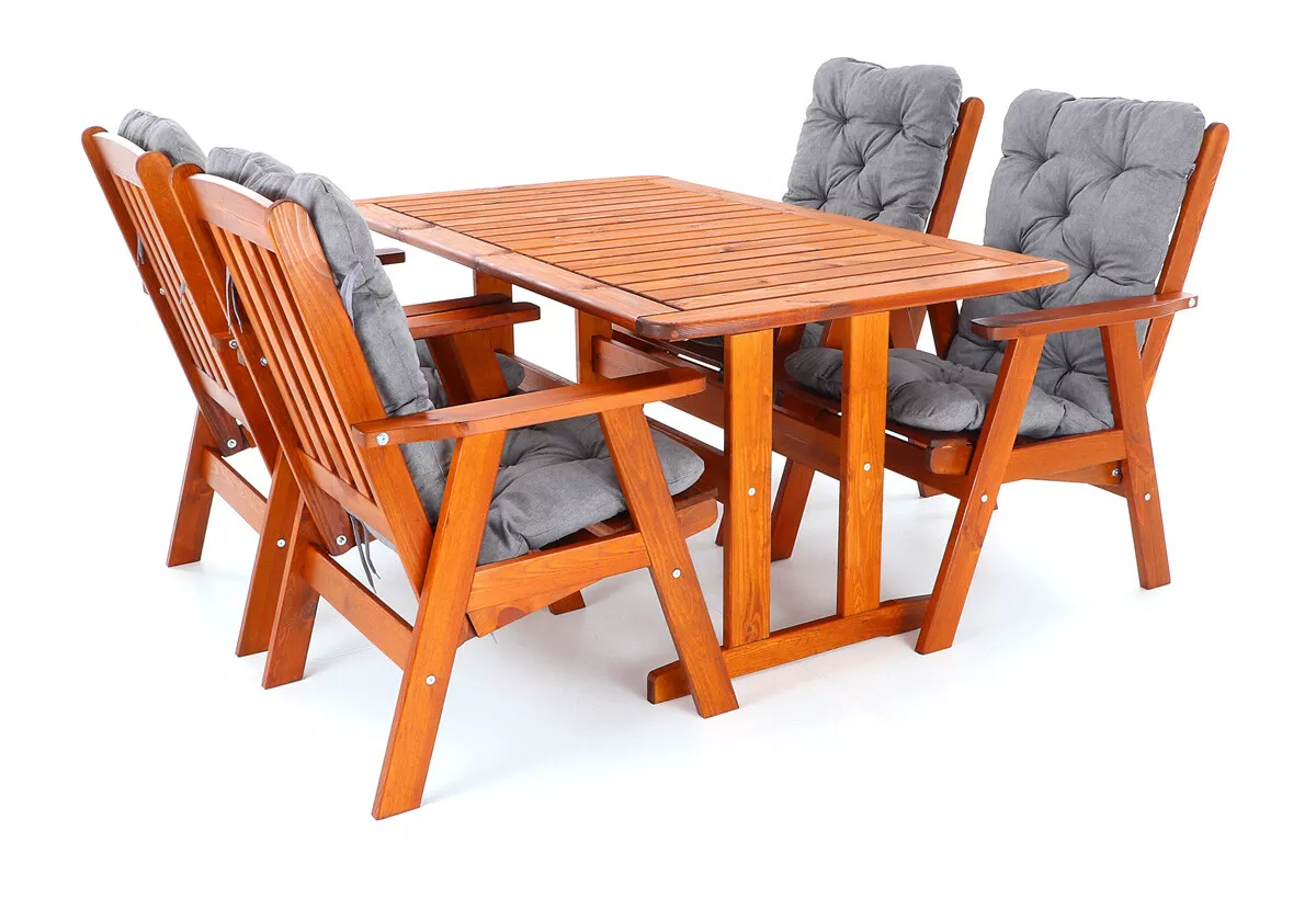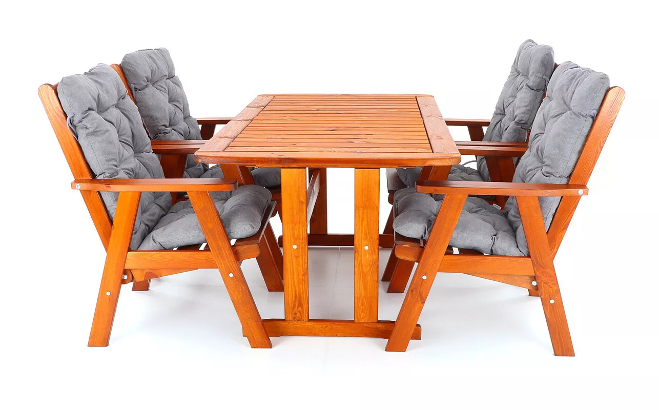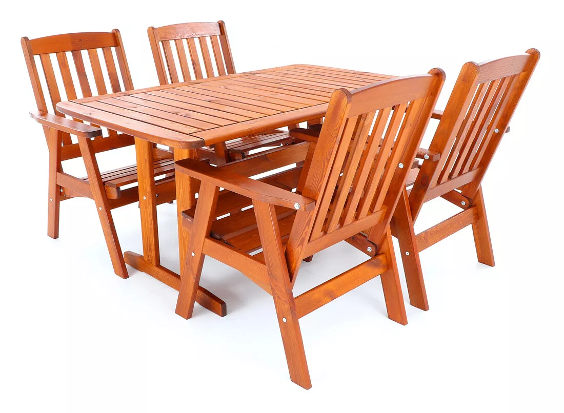 - Luxusní masivní stolová sestava čtyř polohovacích křesel a stolu z odolného a trvanlivého dřeva severské borovice. Odolné dřevo a velmi robustní konstrukce řadí tuto sestavu mezi nejmasivnější výrobky ve své kategorii na trhu.