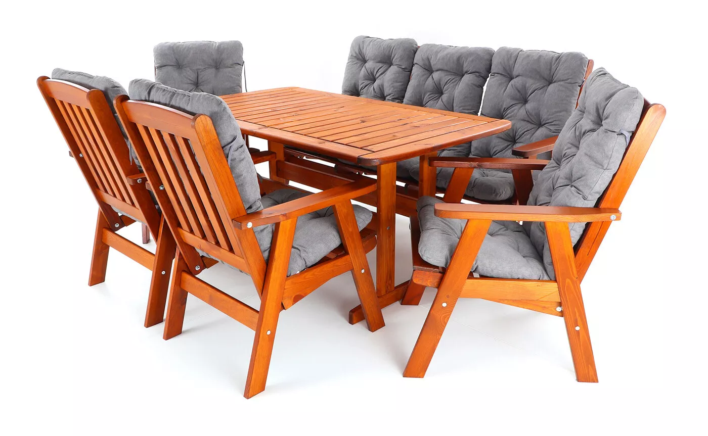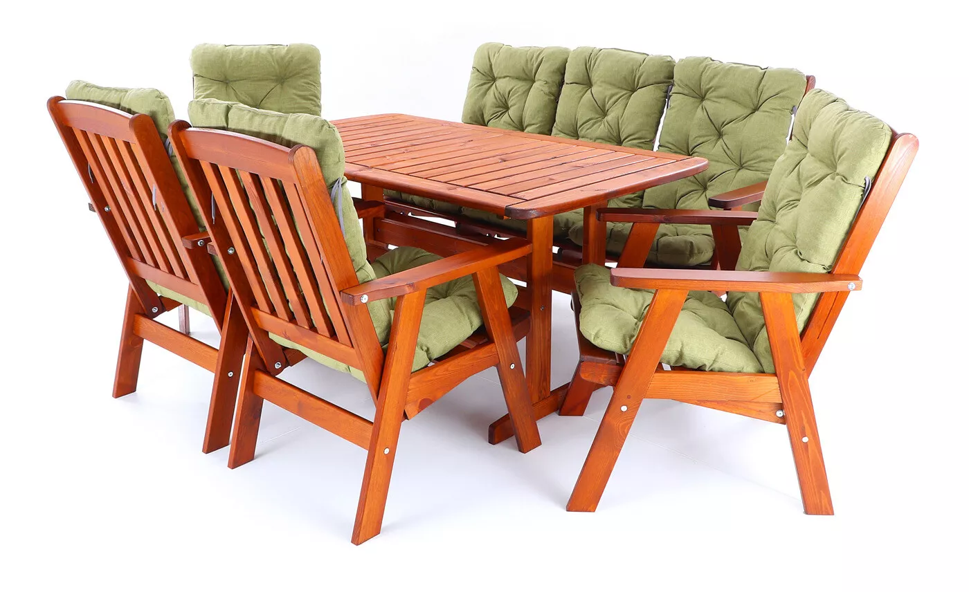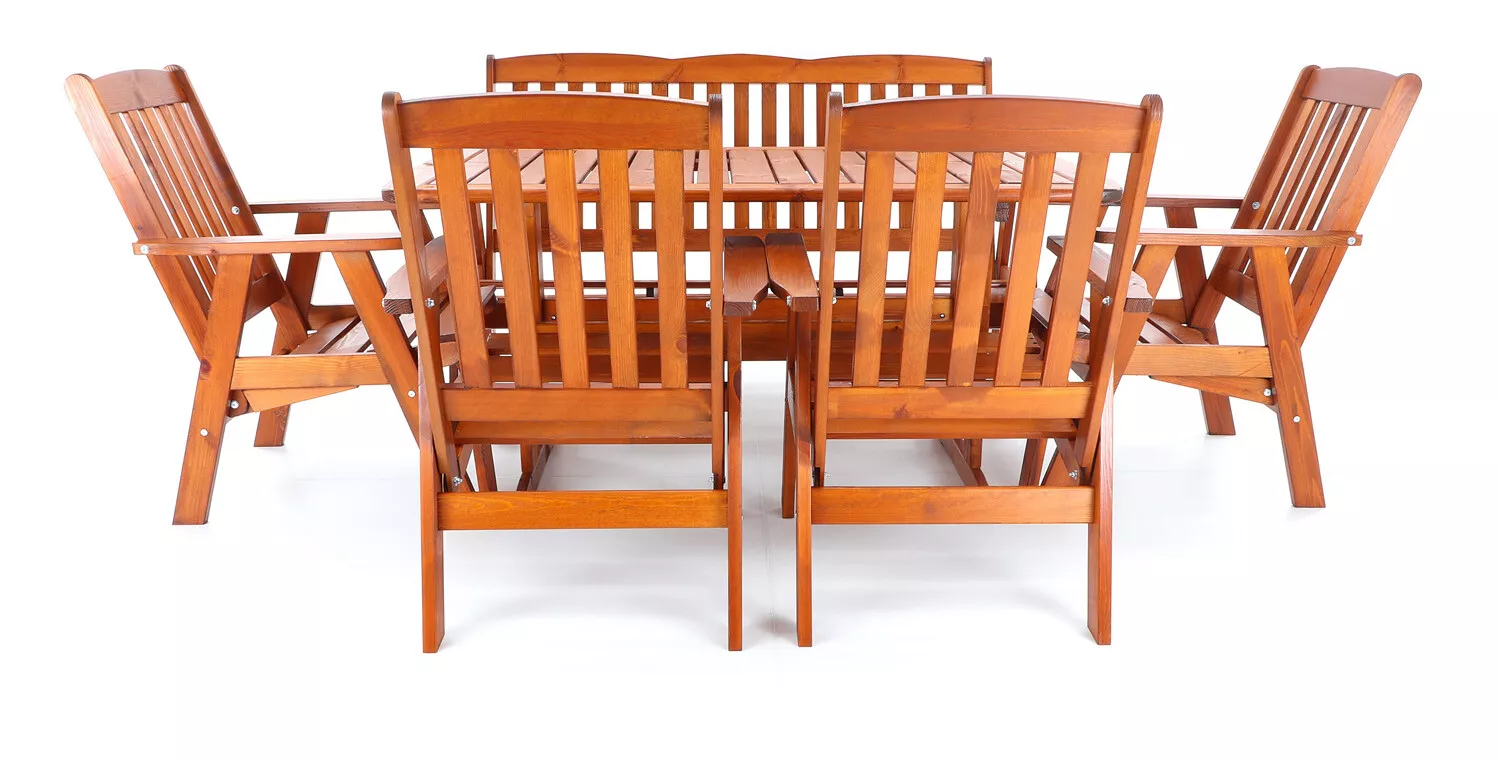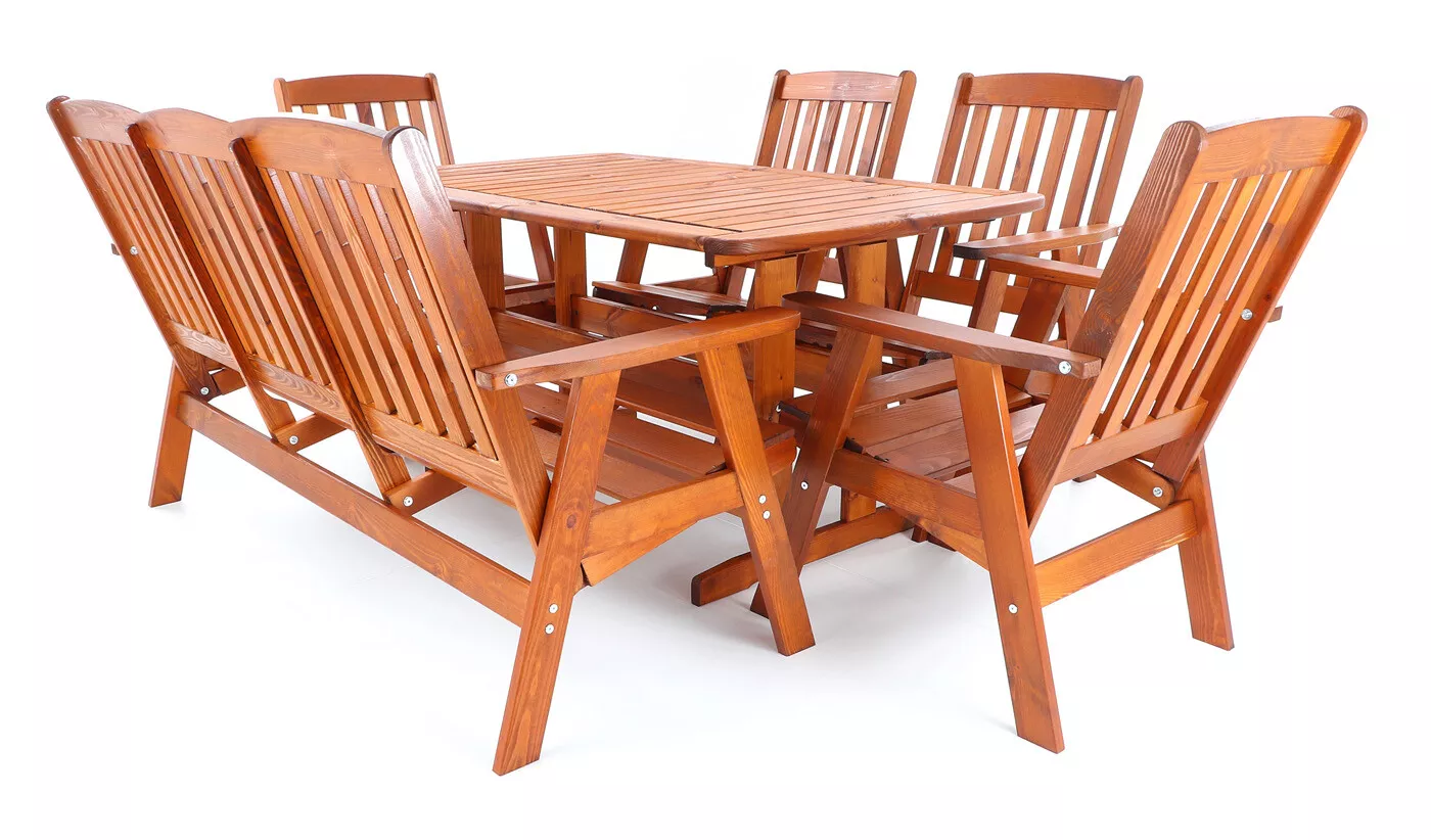 - Luxusní masivní stolová sestava čtyř polohovacích křesel, jedné polohovací lavice a stolu z odolného a trvanlivého dřeva severské borovice. Odolné dřevo a velmi robustní konstrukce řadí tuto sestavu mezi nejmasivnější výrobky ve své kategorii na trhu.