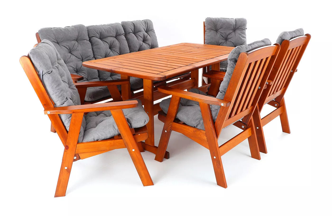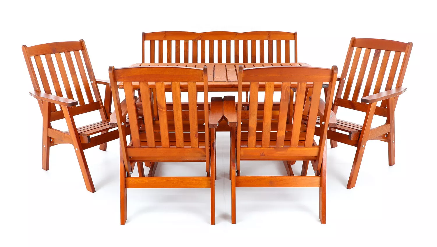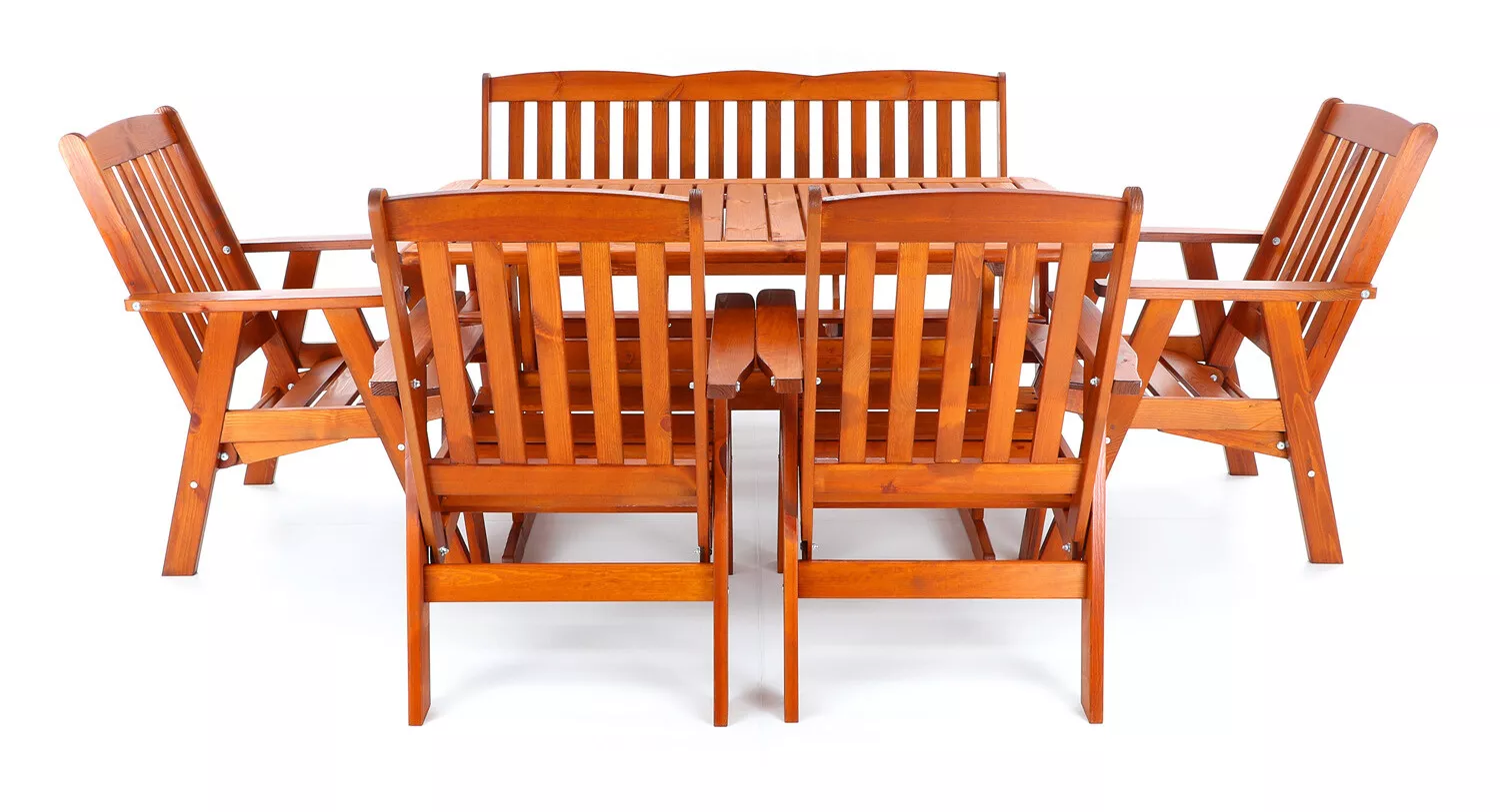 - Luxusní masivní stolová sestava čtyř polohovacích křesel, jedné polohovací lavice a stolu z odolného a trvanlivého dřeva severské borovice. Odolné dřevo a velmi robustní konstrukce řadí tuto sestavu mezi nejmasivnější výrobky ve své kategorii na trhu.